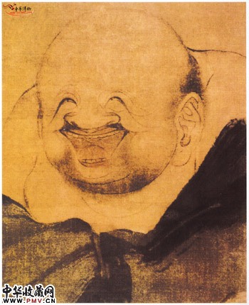 此画绘布袋和尚半身像,构图简明而有力,用笔简练粗放,尤其以布袋和尚的衣袍最为突出,寥寥数笔,神态活现,有如画山石一样雄浑有力,又不失衣袍的柔和随意,笔意十足,重墨渲染。如除去布袋和尚的上半身不看,其构图仿佛是一座雄健的远山,稳健而广阔,而绘布袋和尚的圆颅硕躯时,转而用工细流畅的笔法,以工笔绘眉眼唇齿,笑容可掬,其淡泊而又嘻笑于世的神态表现得淋漓尽致,虽有一股玩世的态度,却又显示出其宽厚、仁慈、悲天悯人的另一面,这也正是梁楷处世态度的一种写照。