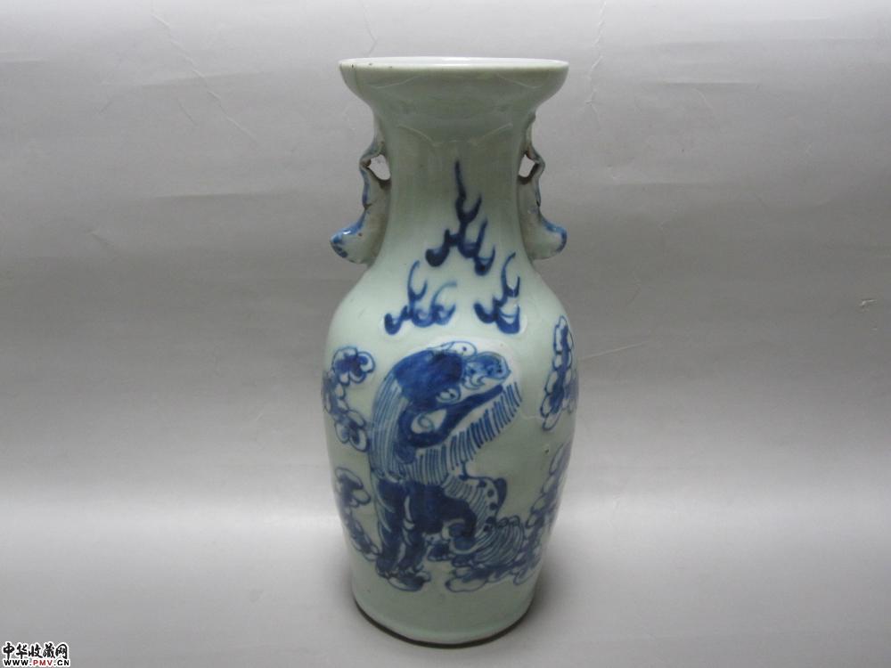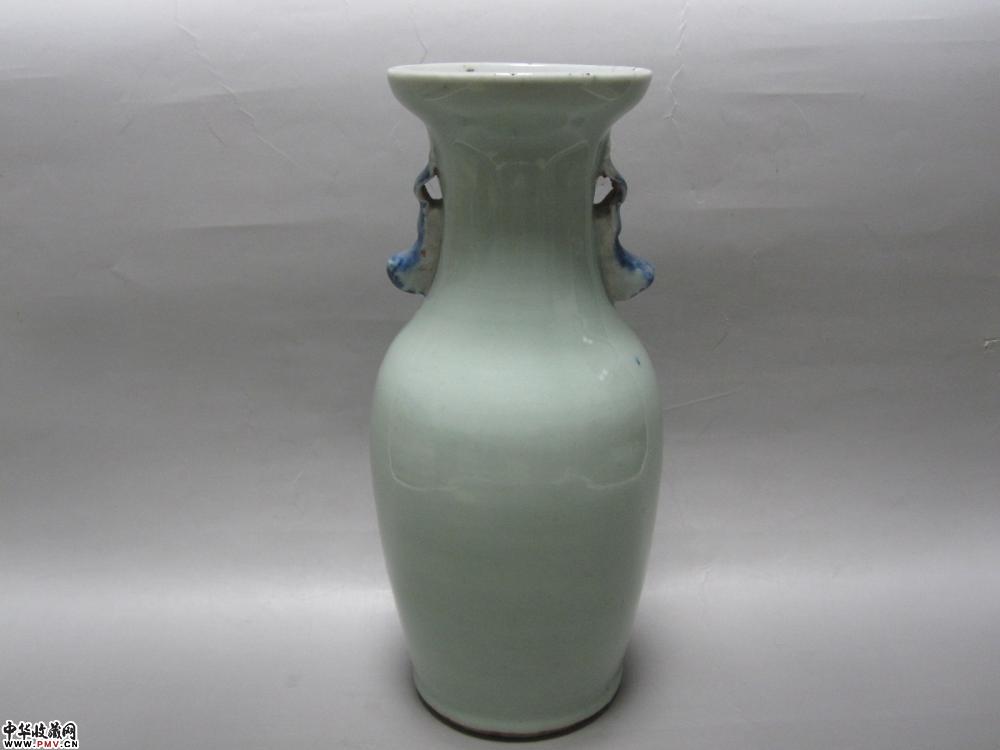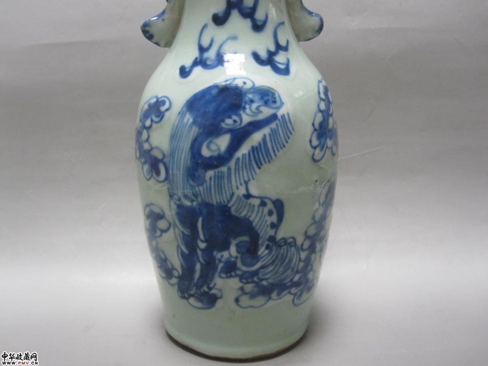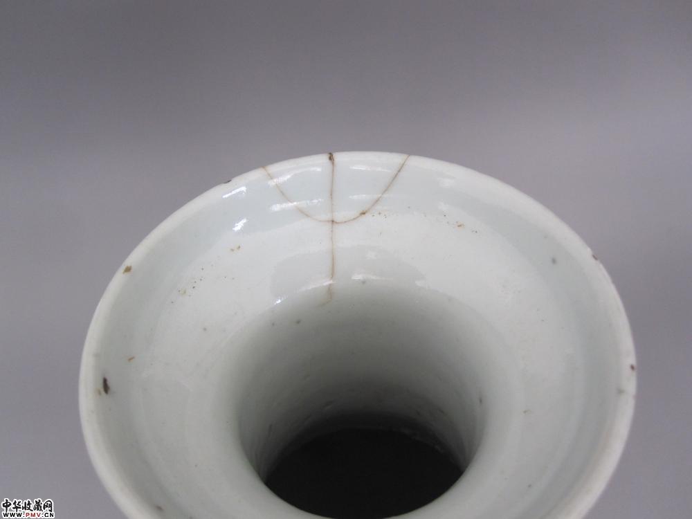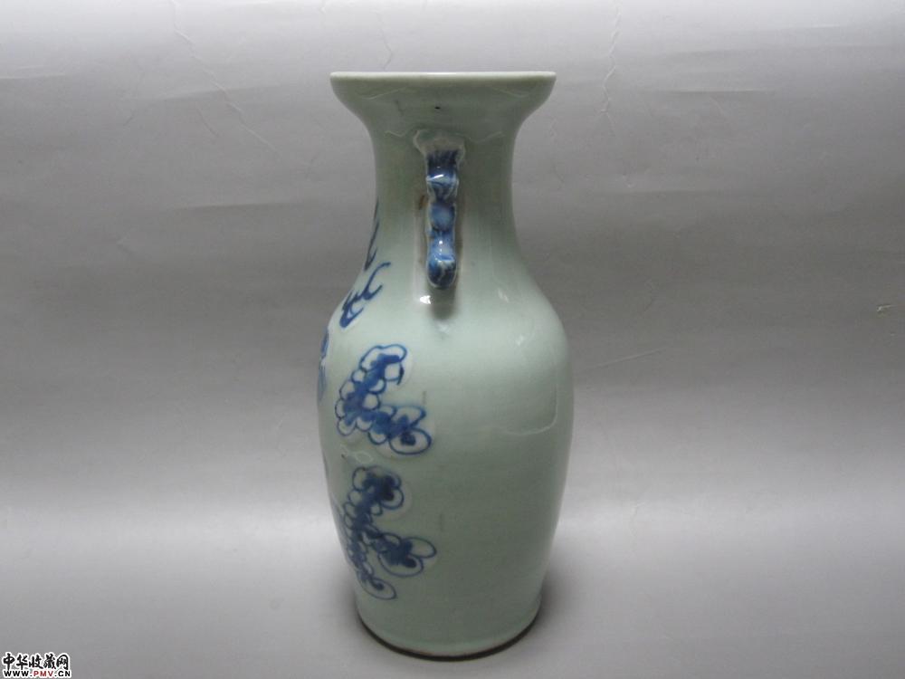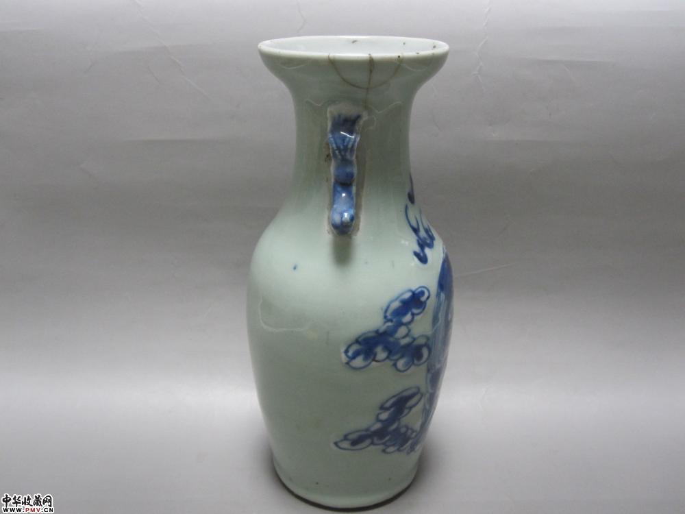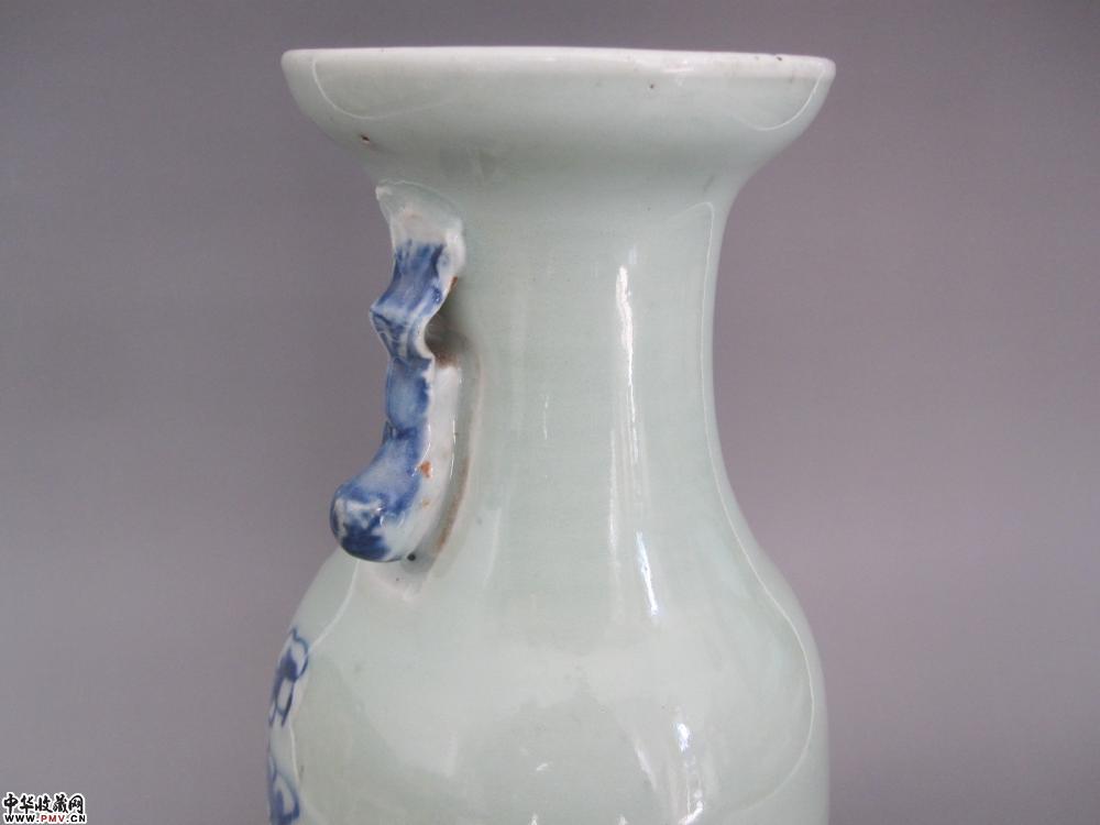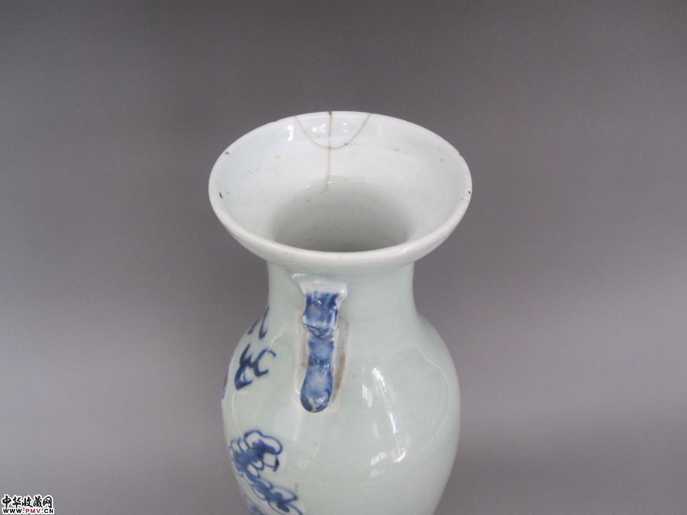 尺寸、高:23.5厘米,口径:8.3厘米,足径:8厘米。品相:口沿一小鸡爪。其它完好。青花发色.釉水都美好。