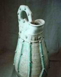 辽代特有的陶瓷器型。亦称“马镫壶”、“皮囊壶”。是模仿契丹族皮囊容器的样式而烧制的陶或瓷壶。装水或盛酒的器皿。扁体,下腹部肥硕,上腹部一端有向上直立的管式短流,余部边缘呈板平的一半云头形或满弓式提柄,与流连接很像公鸡的顶冠,故名。鸡冠壶多为白釉、黄釉、绿釉,且施半釉,具有民族特色。式样大体可分五种:扁身单孔式、扁身双孔式、扁身环梁式、圆身环梁式、矮身横梁式。其年代早晚,通常以壶身所保留的皮囊容器特点的多少来区分。辽宁省北票市北四家子出土有一件高31.5厘米的鸡冠壶,壶体宽面部分饰以贴花和划花,施绿釉,是鸡冠壶中的精品。在迁安县上炉村辽墓中,还发现具有辽代契丹民族文化特征的鸡冠壶。