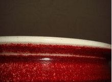 郎窑红釉,釉汁凝厚,焙烧时,器物上部釉汁向下流动,口沿部分釉层减薄,釉层里的铜红胶体粒子也下坠,使露出的胎体和淡色薄釉,宛如一圈灯草围于口部,故称“灯草边”,也叫“脱口”。是郎窑器的一种主要特征。