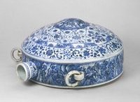 瓶直口,短颈,颈部凸起一周弦纹,一侧饰小系。腹体一面扁平无釉,中心凹进如脐,另一面隆起,中心凸出如半球状,肩两侧各有一活环耳。通体以青花装饰,口沿处绘缠枝花,腹部凸起处饰海水江崖地八角锦纹,内绘缠枝花,其外围饰缠枝花,瓶壁侧面饰海水江崖纹。青花色泽浓艳,纹饰流畅自然,极富动感。