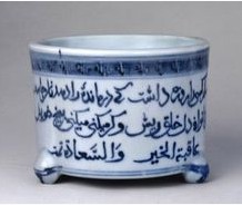 炉呈筒形,唇口,平底,下承以三足。内光素无纹饰,外青花装饰。口沿处绘青花单线连续回纹一周,炉底边有两条青花弦线横越三足。腹部以青花料书写有三行波斯文,取自波斯诗人萨迪的诗集《果园》。译文为:“年轻人啊,要敬主就应在今天,明朝人老青春一去不还。只自己守斋还不算真主的穆斯林,还应分出食物周济贫人。如今你心无烦扰,身体有力,身在宽广球场应把马球猛击。为政万万不可刺伤平民百姓的心,欺压百姓就是在掘自家的根。谦逊的智者宛如果树一棵,挂果越多枝头越加弯曲。”内底署青花 楷书“天顺年”三字款。