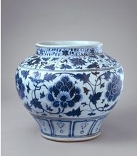 这件青花罐造型饱满庄重。青花色调明艳,呈宝石蓝色而带黑色斑点,表明使用的是外来青料。画笔流畅,构图繁而不乱,每层纹饰之间因有弦纹相隔,既突出了主题图案,又增加了画面的层次感。