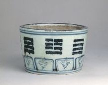 炉筒形,方唇,直口,斜壁,口径略大于底径。胎细白。内壁近口缘处、口沿及外壁施釉,釉层温润,微泛白。沿部青料满铺。外壁近口沿处与近底处各绘青花弦纹两道,腹部绘青花八卦纹、仰莲瓣纹。