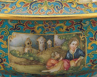 元末明初的掐丝珐琅器釉质细腻,色调纯正,鲜艳明快,具有水晶般透明感。通常以浅蓝色作地,间饰红、黄、白、绿、紫、深蓝等色釉。从明宣德晚期开始,釉色略显灰暗,光泽度降低。这一时期的掐丝珐琅器地色除浅蓝色外,宝蓝色应用广泛。到万历年间,更出现了淡青、白等中间色地。珐琅色釉有所增加,新出现了赭、豆青、松石绿等色釉品种。 清代的珐琅釉料品种丰富,所用色釉达几十种之多。但其有一个共同点,皆不透亮。 珐琅釉料的另一特征是表面沙眼现象,是由于硼酸盐含量过高以及烧制过程中的氧化还原作用所引起。工匠们常用“蜡补”的方法来补救,即用石蜡加入色粉制成色蜡,填充于沙眼之中。到乾隆时期,经改进工艺,杜绝了沙眼现象。 景泰蓝以它那鲜明的民族风格和绚丽的艺术风采,在世界掐丝珐琅工艺中独树一帜。那些仿制的似是而非的景泰蓝赝品,无论在材料、质地还是艺术风格上均无法与明清制作的掐丝珐琅器相提并论。只要熟悉掌握明清掐丝珐琅器的制作、材料和艺术风格等特征,一望便可断定其真伪。上一篇:清乾隆掐丝珐琅御制诗挂屏