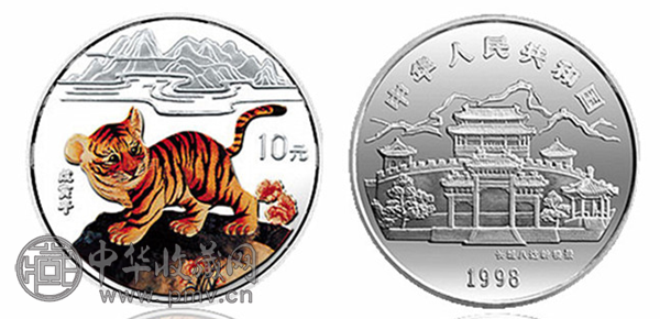 【藏品名称】1998戊寅(虎)年金银纪念币圆形1盎司彩色银币