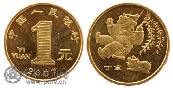 该普通纪念币正面刊“中国人民银行”、“1元”和汉语拼音字母“YIYUAN”及“2007”年号;背面图案为小孩与生肖元素,其下方刊“丁亥”。