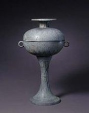 嵌松石蟠螭纹豆(2张)豆圆形,两侧有双环耳,束腰,高足,盖顶有平捉手,可以倒置。盖、器身饰蟠螭纹,高足两端饰垂叶纹,中部饰菱纹。通体纹饰均以松石镶嵌。