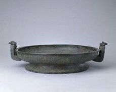 盘侈口,浅腹,圈足外撇。双附耳起于腹部,耳之上边缘处各饰一对伏牺。盘外壁以一蟠螭纹为主体纹饰。