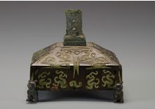 此展品为战国时期的金属器,由承插柱、座体和垫脚三部分组成。现收藏于浙江省博物馆。