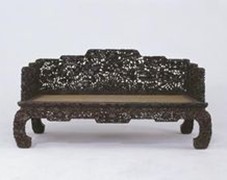 此床紫檀质,面装屉盘,面下束腰,鼓腿膨牙,内翻马蹄足,床面上装三屏风式床围。束腰及牙条浮雕荷花莲蓬纹,腿、足部雕密不露地的荷花纹,床围透雕荷花莲蓬纹。