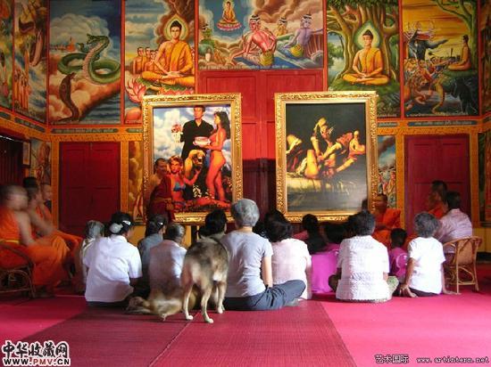 杨福东《竹林七贤》,2003年不过,在展览入口处,来自巴基斯坦、柬埔寨、泰国和印度尼西亚的佛教人物头像不再作为佛教仪式的一部分而出现在“情境以外”,作为精美的艺术品被展示。陈文辉表示,安排“情境之外”这一部分是因为他们“有时也希望打破这样一种‘情境’,让艺术品脱出它们的创造和使用环境”。泰国艺术家阿拉雅·拉斯迪阿美恩斯柯(Araya Rasdjarmrearnsook)就以自身的艺术实践重新审视了脱离创作背景的艺术品。在他的组织下,庙宇中的和尚用巴洛克女艺术家阿尔泰米西亚·真蒂莱斯基(Artemisia Gentileschi)和杰夫·昆斯的两幅画向孩子们阐释佛教教义。从影像中可以看到,脱离了文化“情境”的绘画在这里有了完全不同的含义。