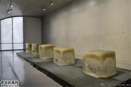 奥拉维尔·埃利亚松《静止的河流》,现场,2016年此次在上海,埃利亚松也结合本地的社会和人文,就地取材,特别制作了作品《静止的河流》。他从紧邻龙美术馆的黄浦江中抽水,注入一立方米的模具中冷冻成形。五个一米见方的冰块按照不同的融化状态排成一列,当其中一块完全融化后将被全新的冰块替代。