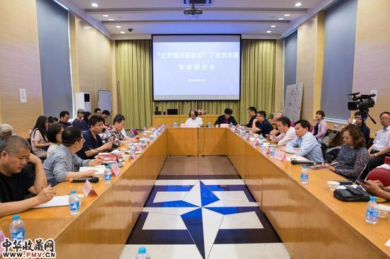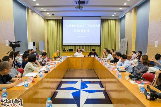开幕式结束后,就展览的主题“文艺复兴在东方”召开了学术研讨会,研讨会由中国国家画院副院长张晓凌主持。丁方教授率先对“东方文艺复兴”进行学理上的阐释,他指出“东方文艺复兴”是沿轴心时代的文化思想、中世纪神学与现代哲学的思维脉络,运用考古学、分子人类学、文化地理学等理论方法,从“中华民族迁徙史”的角度探寻东方文艺复兴的基因与路径,重新阐释“文艺复兴”的深层意义。来自全国各地的专家表达了对丁方作为艺术家坚持行走的力量的敬仰之情,赞扬了丁方多年来艺术信仰的坚守和丰硕的创作成果。 清华大学美术学院教授顾黎明表示丁方做到了用图像的方式表达一种人性的终极关怀。中国国家画院研究员张惠明指出丁方最可贵的不是简单的寻根,或者简单的表现,而是他上升到一种思考,一种精神层面的思考。研讨会上中国艺术研究院博士生导师郑工对丁方的作品进行了细致地个人化地解读,他认为丁方的画整个思考点是对人性和神性的关系上重新进行思考,是一种逆向的思考,表现现实当中的人并寻找其神性。此外,学者们对 “文艺复兴在东方”的可能性和必要性进行了探讨。中国人民大学哲学院教授牛宏宝指出东方文艺复兴不是回到农耕过于时代化的状态,而是回到话语显现当时,即言说的方式。复兴不是回到祖宗那去,复兴是对于道路的重建,是对言说方式的重建。清华大学美术学院副院长张敢对复兴作出的定义为中国的伟大复兴不是回到汉朝也不是回到唐朝,而在今天这样一个语境下,把我们自己了解清楚。复兴的目的是真正让我们的思想、艺术能对这个世界有所贡献。