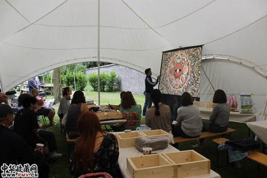 2015年7月,涂维政在英国卡斯雕塑基金会举办《卜湳文明—魂遁之轮》工作坊,介绍过去的作品创作和这次民眾参与计画的关系。(耿画廊提供)