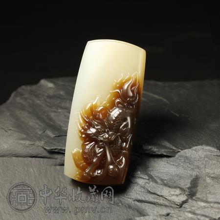 此件玉牌精选糖白玉山料为质,巧用糖色,精琢一只踏云而来、口吐瑞珠的赤色麒麟。整器牌型工整,色泽匀净而糖色分明,麒麟龙头狮眼,踏空而行,周身宝光氤氲,瑞气千条,自具祥瑞之态。
