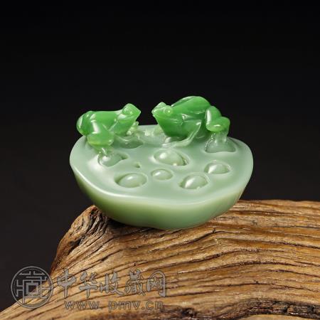 小小巧巧一莲蓬,双蛙对面鼓腹而鸣。蓬内莲子饱满,俏色双蛙颜色明丽,荷塘丽景,于焉展现。青蛙在玉雕中常有顶呱呱等寓意,莲蓬则有子孙繁茂之意。扬州工艺美术大师冯钤作品,底部落有款识。