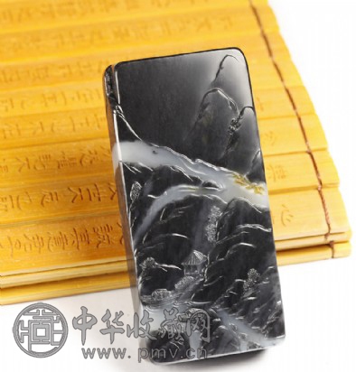 整器雕工大气,既有写意山水的雄浑磅礴,又不失工笔画的细腻婉约。白水黑山,江流礁石乃至野亭小舟,处处随形就势,却又恰到好处。山腰处,云遮雾绕,双鹰翱翔,有溪流潺潺,顺势而下;山下,江流宛转,礁石盘踞;山势平缓处,有拙朴亭台,双舟将归未行。背面只略作勾勒,但因为天然沁染的缘故,仍给人暮色四合、雨雾空濛的感觉。上方镌有“知归”二字,左下侧落有扬州工艺美术大师冯钤款识。