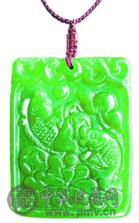 经常听藏友说起老翡翠过不了机器检测关,为探究竟,上周我选了一块清代双面浮雕“连年有余”满绿方形翠牌,送到一家国家认证的宝石鉴定中心检测。鉴定结果是“酸洗、填充、染色处理”,换言之,就是B C货。