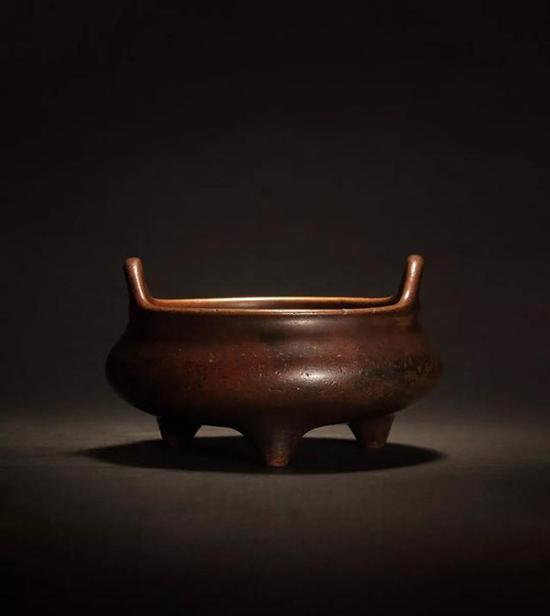 冲耳炉的造型是宣德炉中最为经典的,明清时期以此形造炉者最多。其中,明炉扁宽而沉实,清炉饱满而略高。据此炉之造型,应为明器焉。此炉壁薄扁宽,重心垂中压手,弧而圆满雅致,双耳椭圆,孔如蚕豆,垂腹鼓沉,三足适中;足、款、双耳平行相对,内膛平滑有弦线,内沿舒展有回廊,与《俪松居遗珍》一书中“顺治比丘”炉形相近,且又多了许多古拙之气。此炉皮色枣红,盖朱砂、硼砂等矿物颜料烧炼着色也。岁久,浅淡相渗,参差烟岚,沉浓蕴光,凝肤润脂,怡目怡神养性焉。