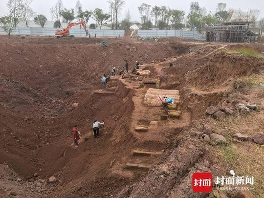 26日上午,封面新闻记者来到该施工工地,走进正在建设的园区,在一处围起来的施工现场,发现了正在进行保护性发掘的古墓葬。只见施工现场有一处大土坑,坑内有8、9名人员正在进行发掘。在大土坑的半坡,露出了石棺等古墓葬的部分设施。