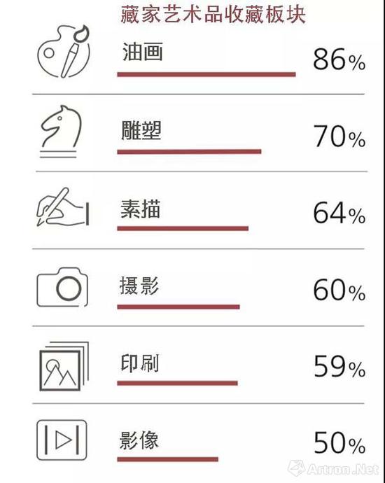 在板块方面,油画依旧是最热门的板块,超过八成的买家投资了油画。雕塑板块列居第二,七成的收藏家购买了雕塑作品。
