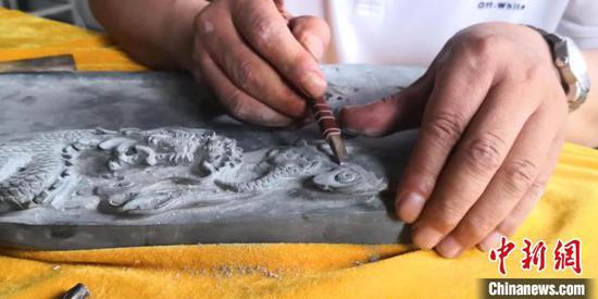 图为岷县洮砚艺人精细雕刻。 张婧 摄