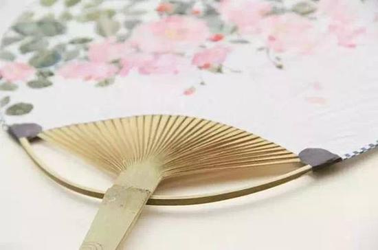 第二,构图时要考虑扇子的形状。圆形、方形,不同扇形的扇面由于长宽不同,图案的构图方案也要随之调整,因此要设计出最和谐的构图以确保扇面不会留白太多或者图案过大。以折扇为例,折扇在绘制前要抽出扇骨,用刷子蘸水把扇面刷平,拿重物压半日,将扇面铺平来绘画,画完再将扇面插回去,涂好浆糊粘在扇骨上。因为扇面的两面都有一侧要粘在扇骨上,因此在设计图案时就要注意扇面两侧要留空。