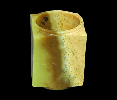新石器时代。2013年打石沟遗址考古发掘出土。通高8.20厘米、边长8厘米、孔径7厘米。青黄玉质,泛浅赭色,较细腻,素面,半透明,表面局部有碱壳附着。通体呈方柱体,对钻中空,内圆外方,两端出短射,射口呈圆形,四面整齐直削,切割规整,抛光精细。