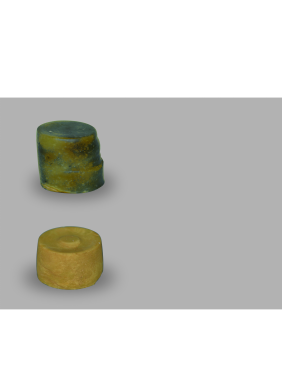 新石器时代。2013年打石沟遗址考古发掘出土。高2.80厘米、直径4.50~4.80厘米。青白玉质,呈柱状,顶端旋磨成凹面,中间凸起一圆泡,凹面内数道同心圆旋痕,器壁有数道细旋痕。