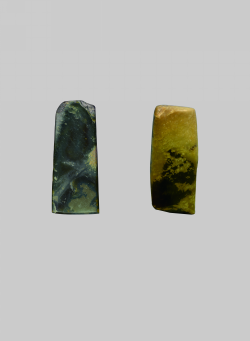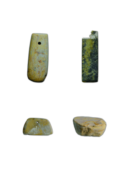 2。新石器时代。2013年打石沟遗址考古发掘出土。通长3.60厘米、宽1.60厘米、厚0.50厘米。青绿色玉质,顶端呈褐色且有崩痕。平面呈长方形。正面圆弧,背面平直且有一条切割线。平直单面刃,通体抛光精细。