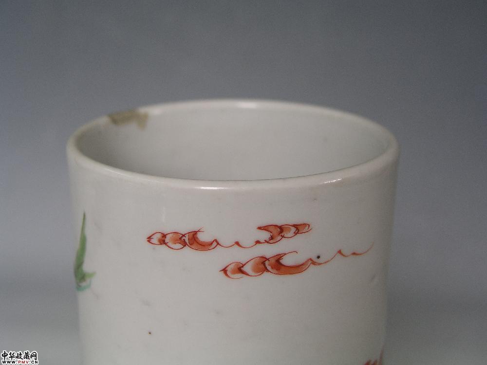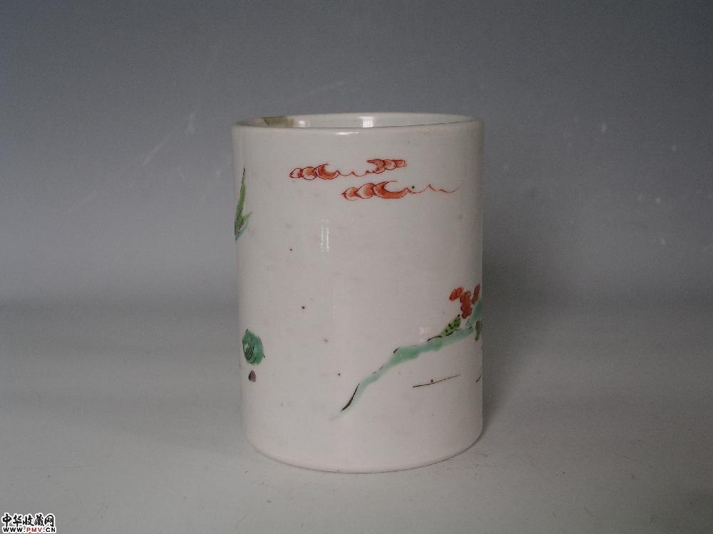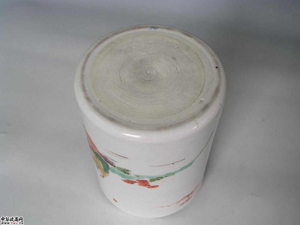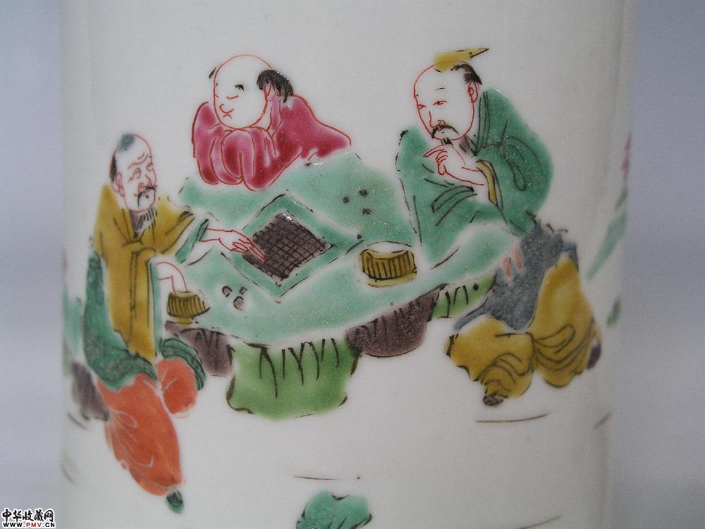 高12cm,口径9.2cm,底经9.4cm,口沿小嗑。此笔筒主题纹饰为粉彩“观棋不语图”。图中两长者于石桌上下围棋,左边长者黄衣红裤,左手伸向棋盘,右手正伸入棋子罐掏棋子,似向对手说该你走了啦;右边的长者绿衣黄裤,头扎黄结,右手指点棋盘,作算计状,好象是说,别忙让我先想想;另有一粉衣少年双手支下巴倚在石桌旁,将头向一旁扭转,作闭目状,其神态好象是说,你们俩个自己走子,我才不帮忙呢!表现出观棋不语真君子的风度,寓教于画,颇有情趣。此笔筒口沿圆润,平底露胎见细密弦纹,制作规整。总体看去,口沿略小,底部略宽,白色底釉细腻肥润,釉上施彩以绿为主,浓淡有别,其他色彩各宜,其位看上去极为谐和调,是清雍正时期民窑佳作。重量:300克