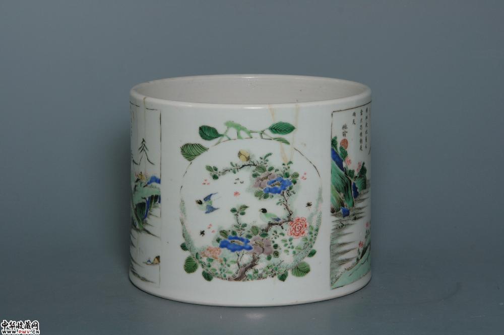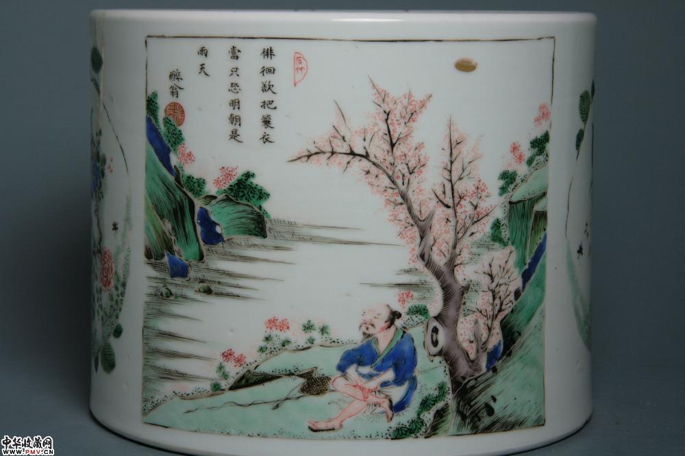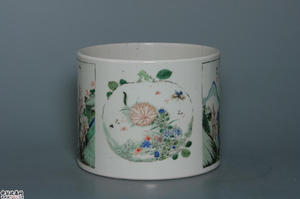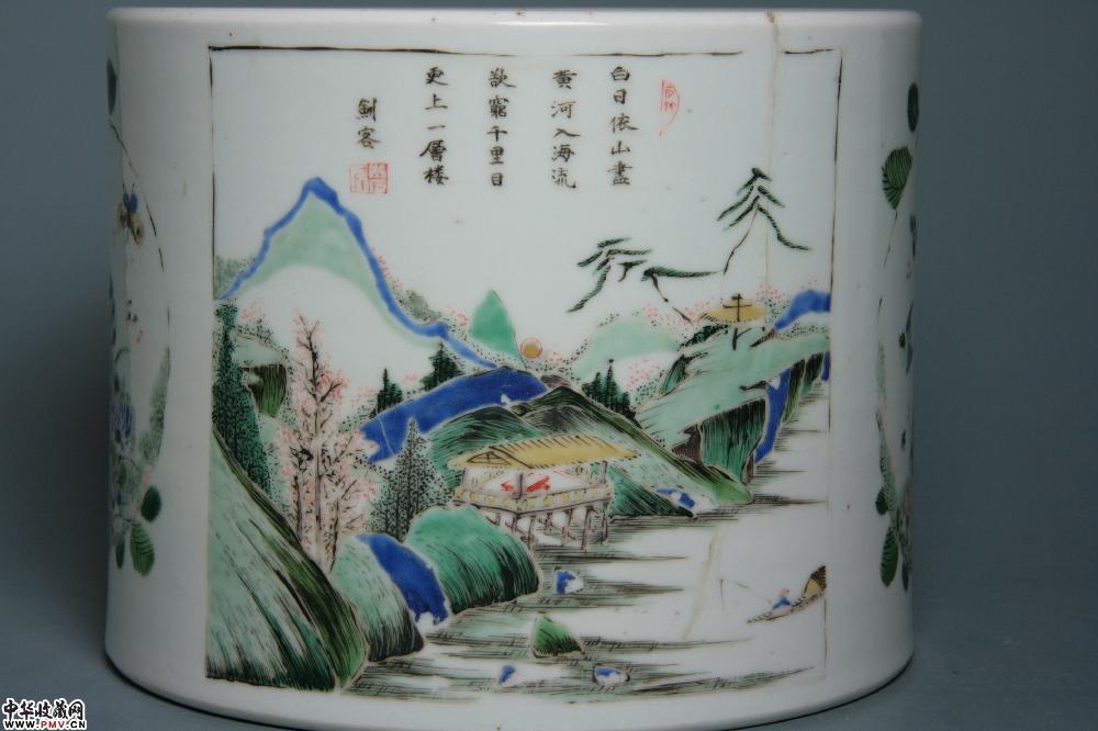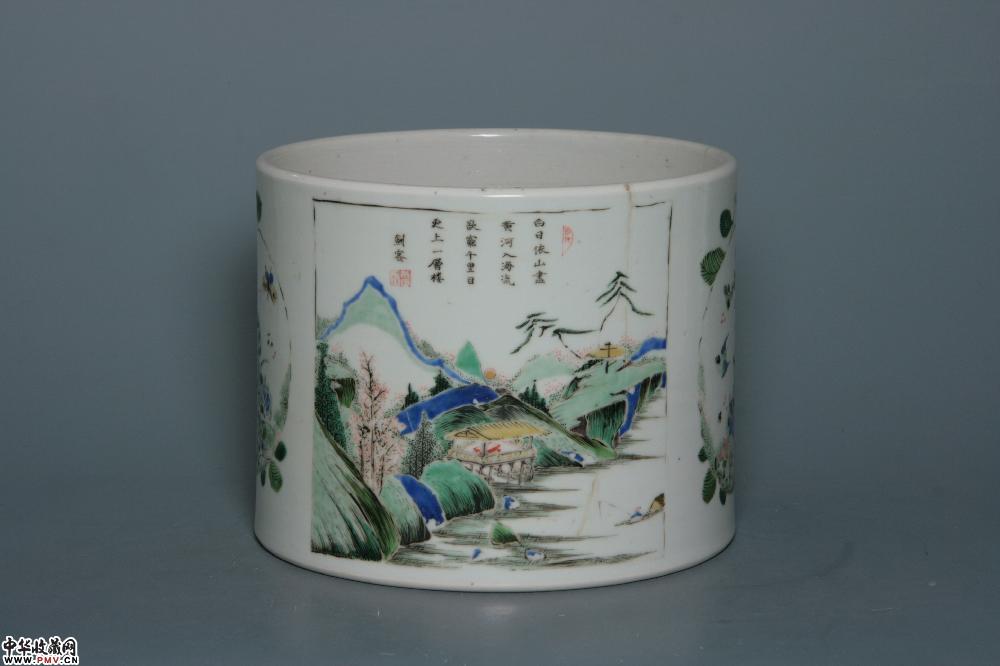 清康熙景德镇窑五彩开光山水诗文笔海