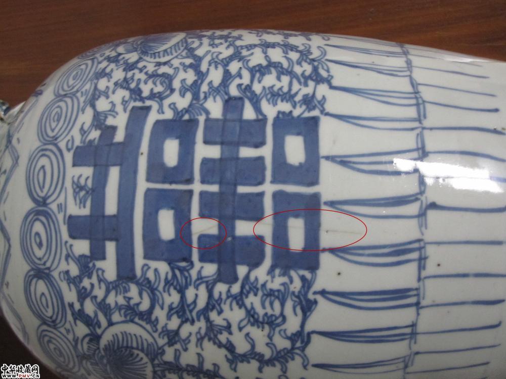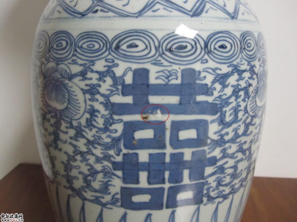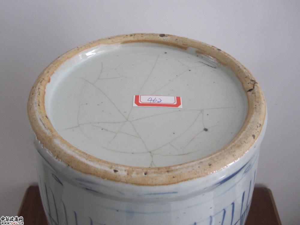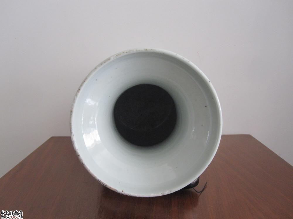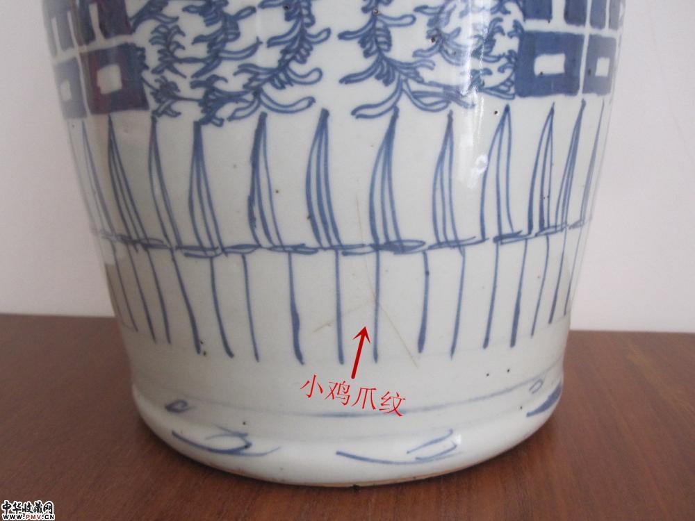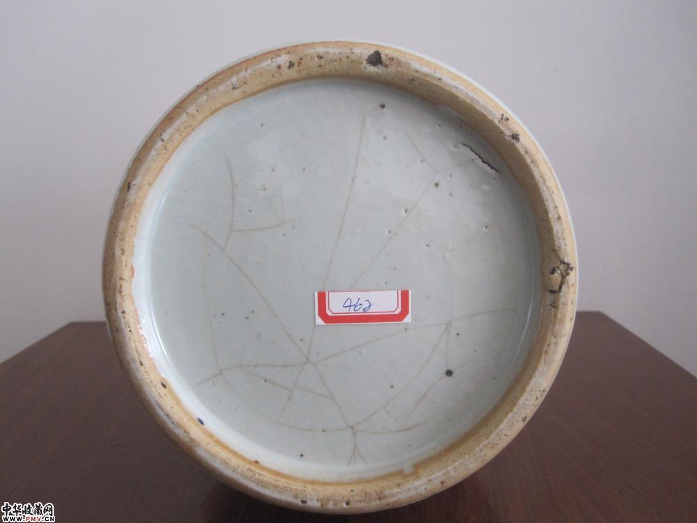 腹部一处粘砂,一处小鸡爪,一处小毛纹,口沿几处爆釉,底足鸡爪纹。高:43厘米。口径:17.5厘米,足径:16.8厘米。