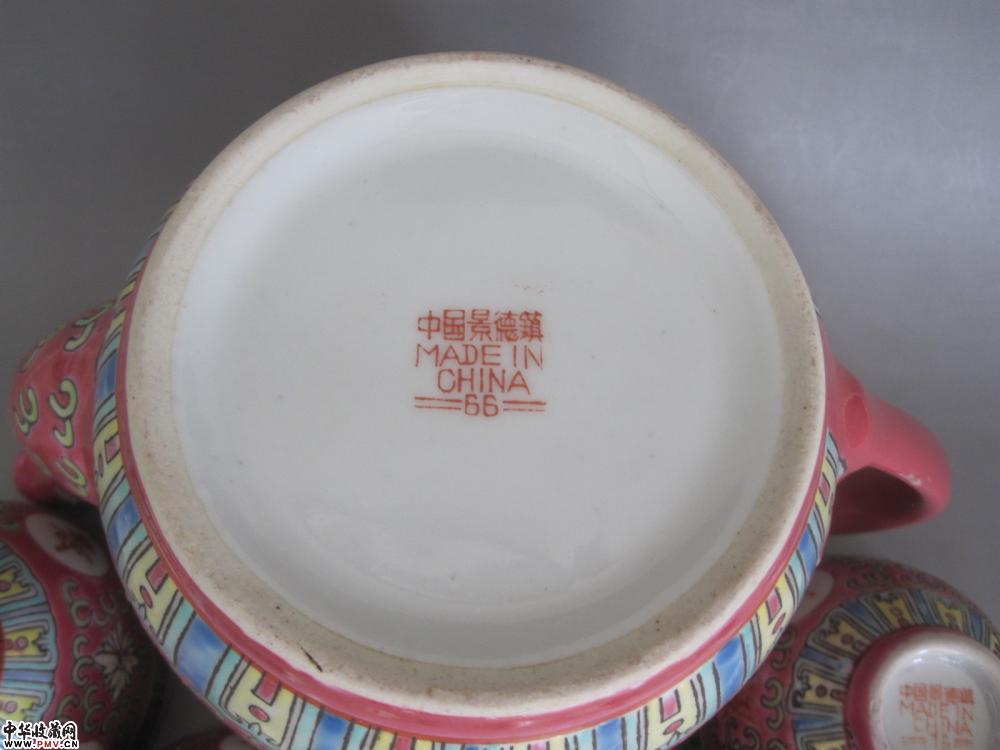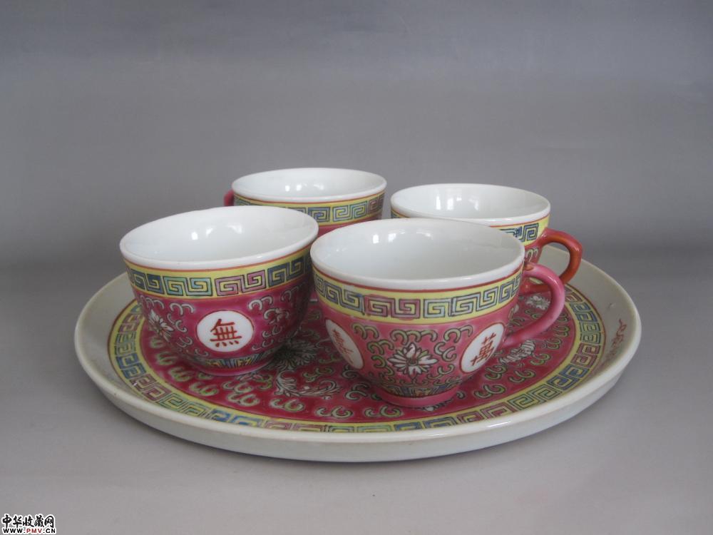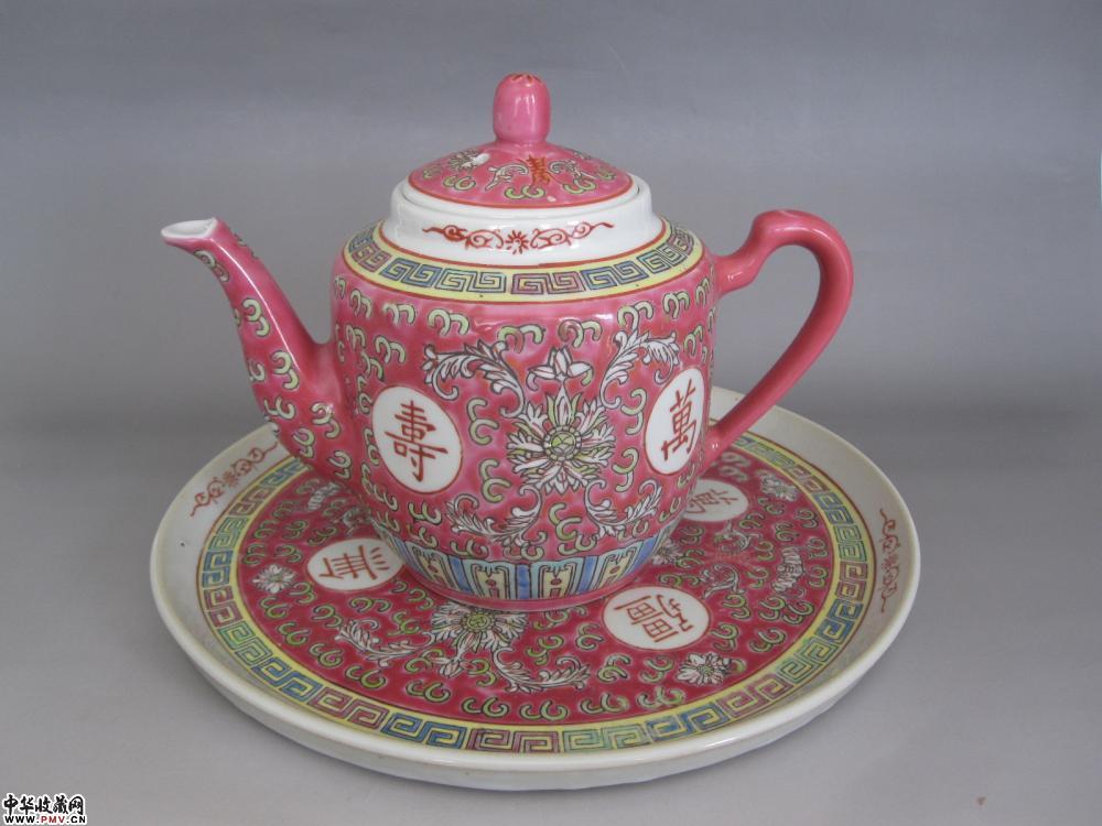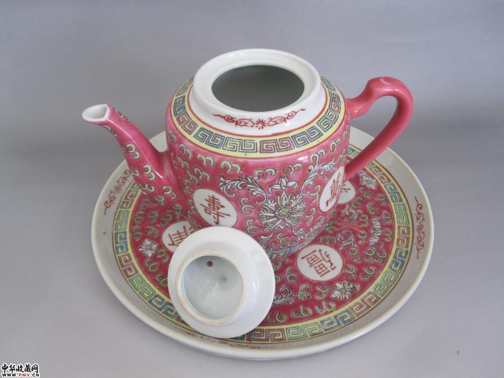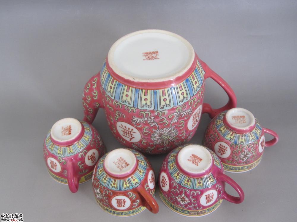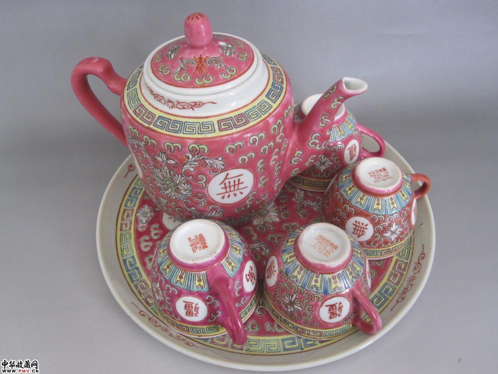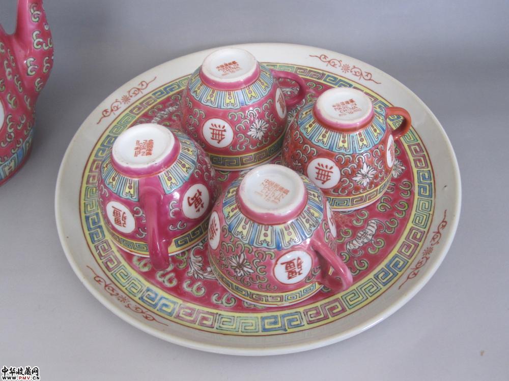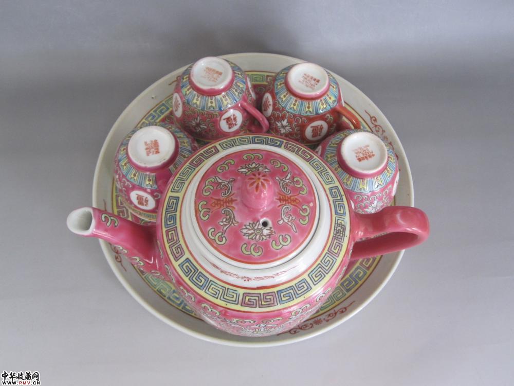 价格、尺寸 茶壶高:16厘米,流嘴到执柄21厘米,茶杯高:5.8厘米,口径:7.4厘米,茶盘直径:26厘米,足径:24.2厘米。、品相完好。