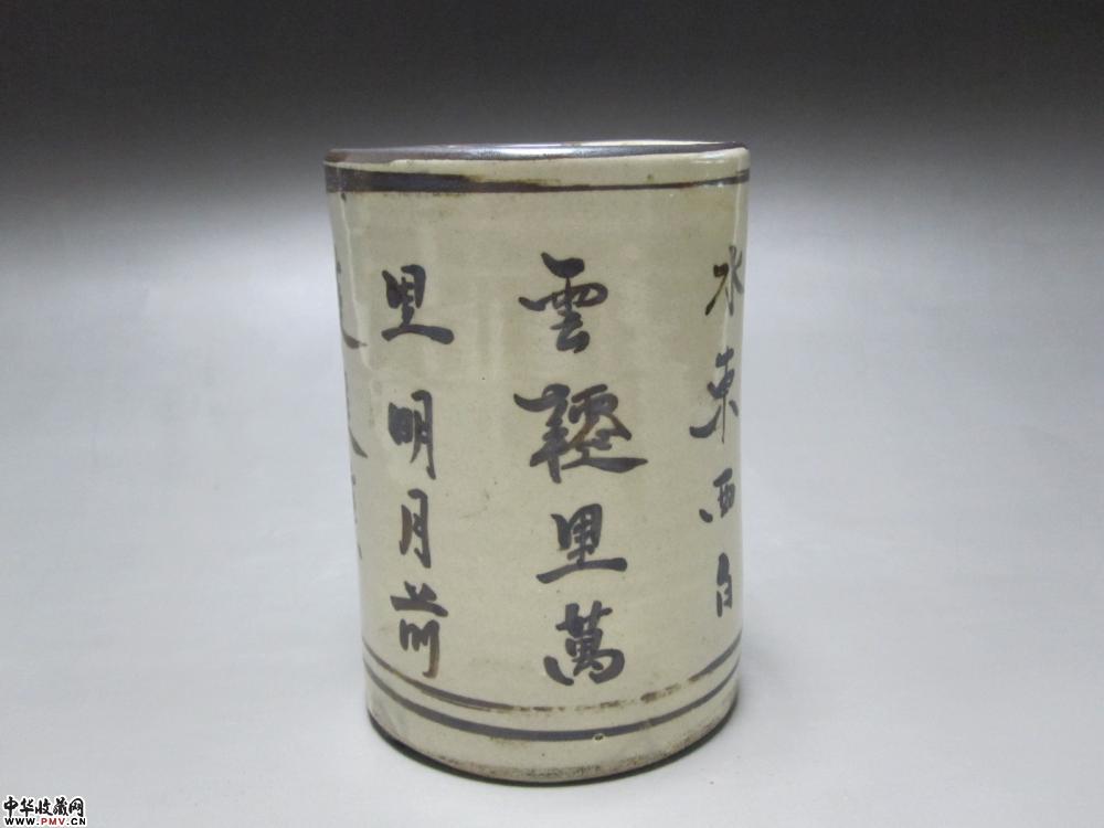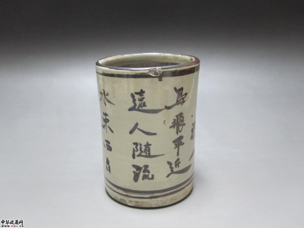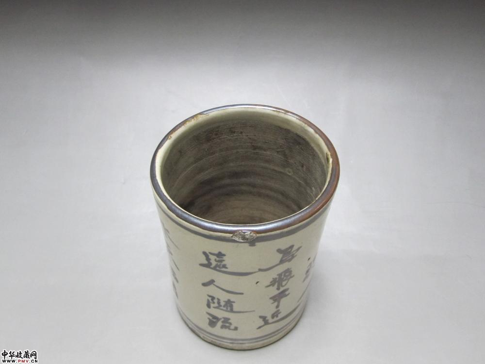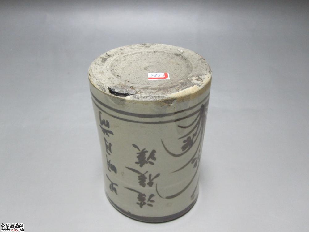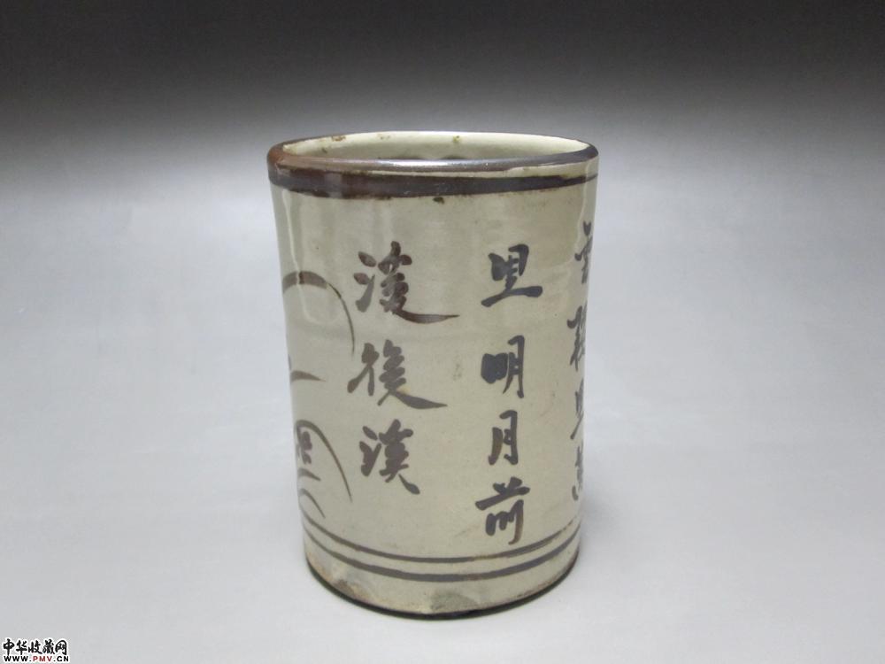 清代磁州窑褐彩兰花文字笔筒
