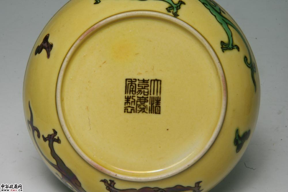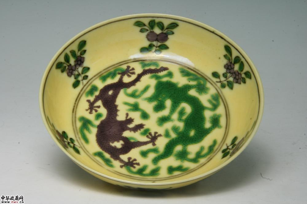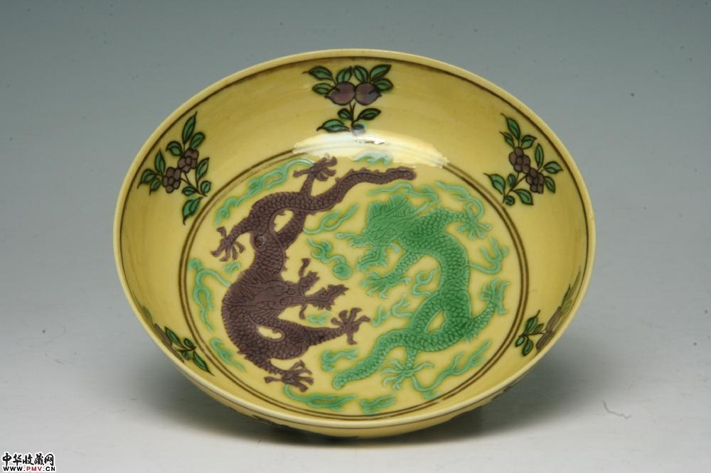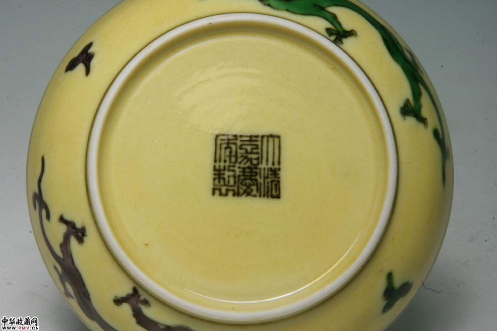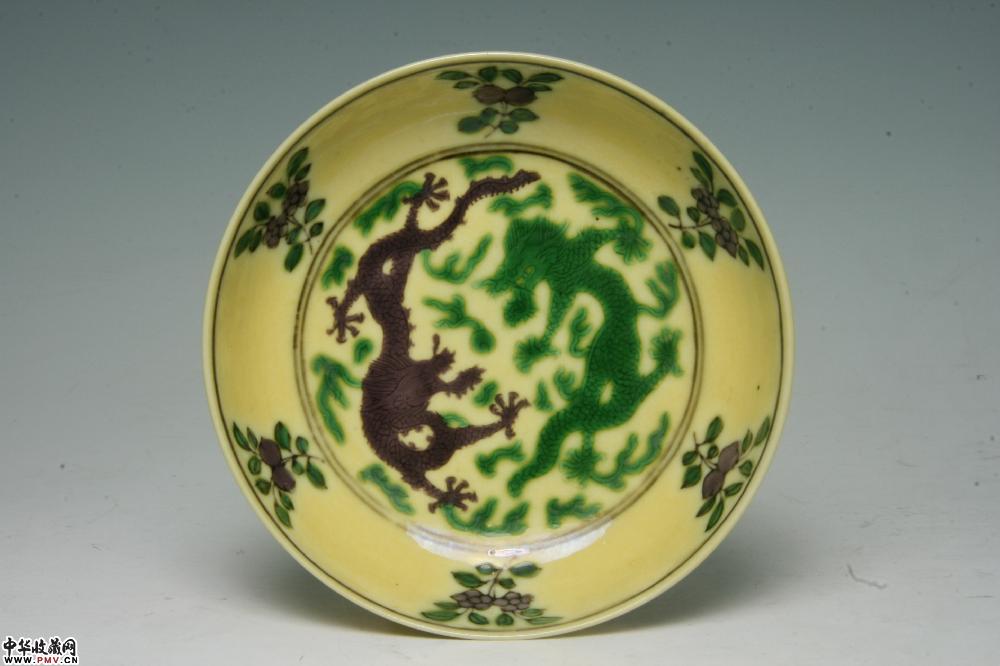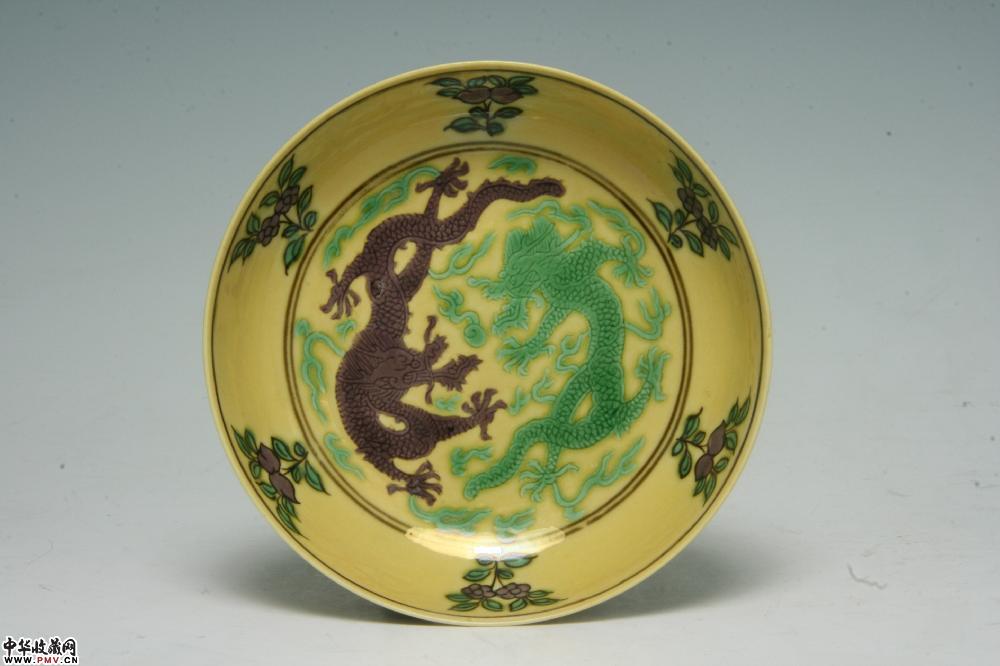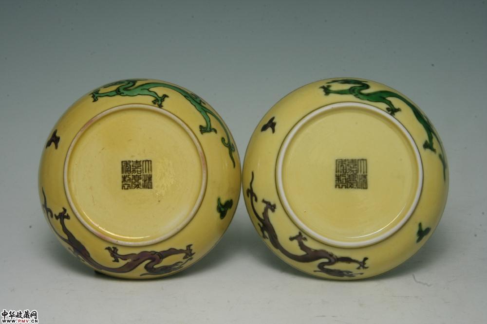 清嘉庆景德镇窑黄地紫绿龙纹碟(一对)