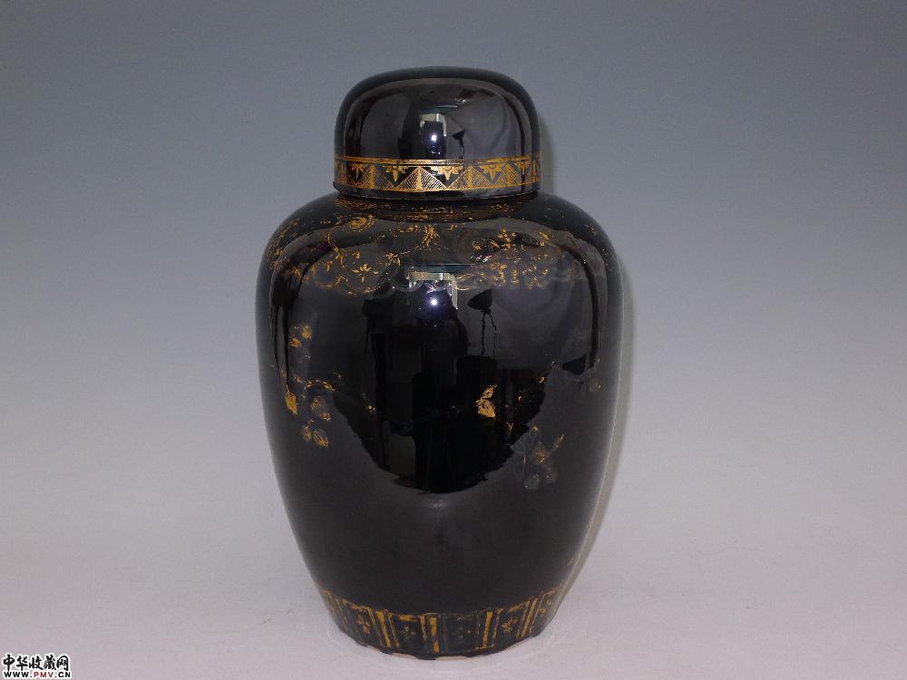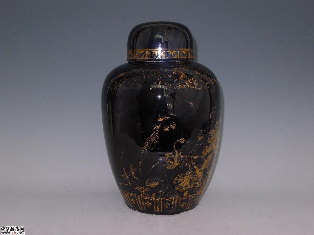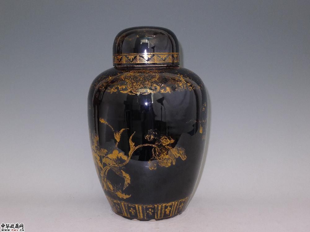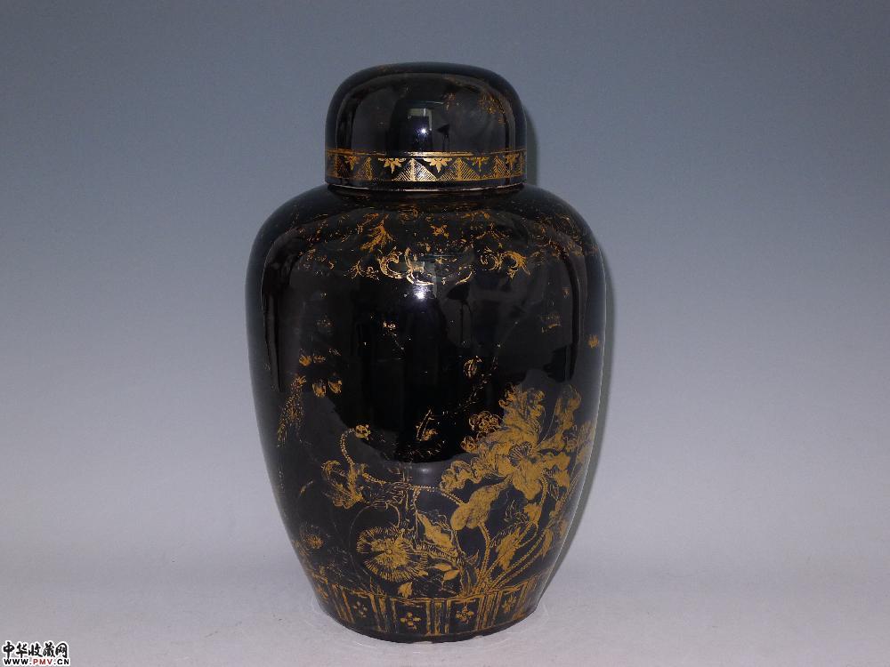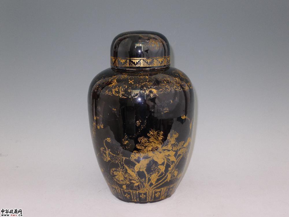 民国乌金釉描金花鸟纹盖罐