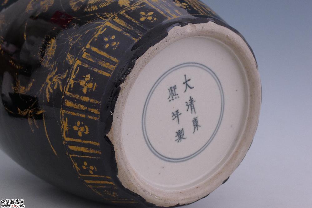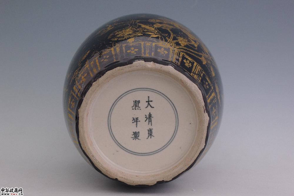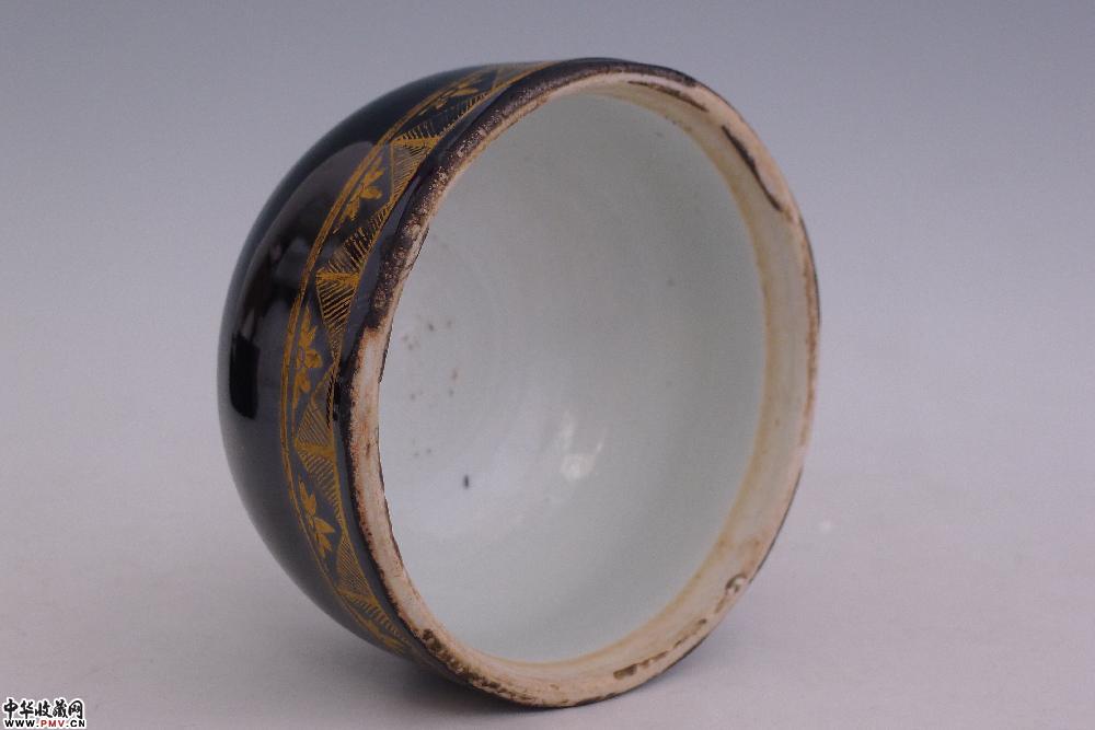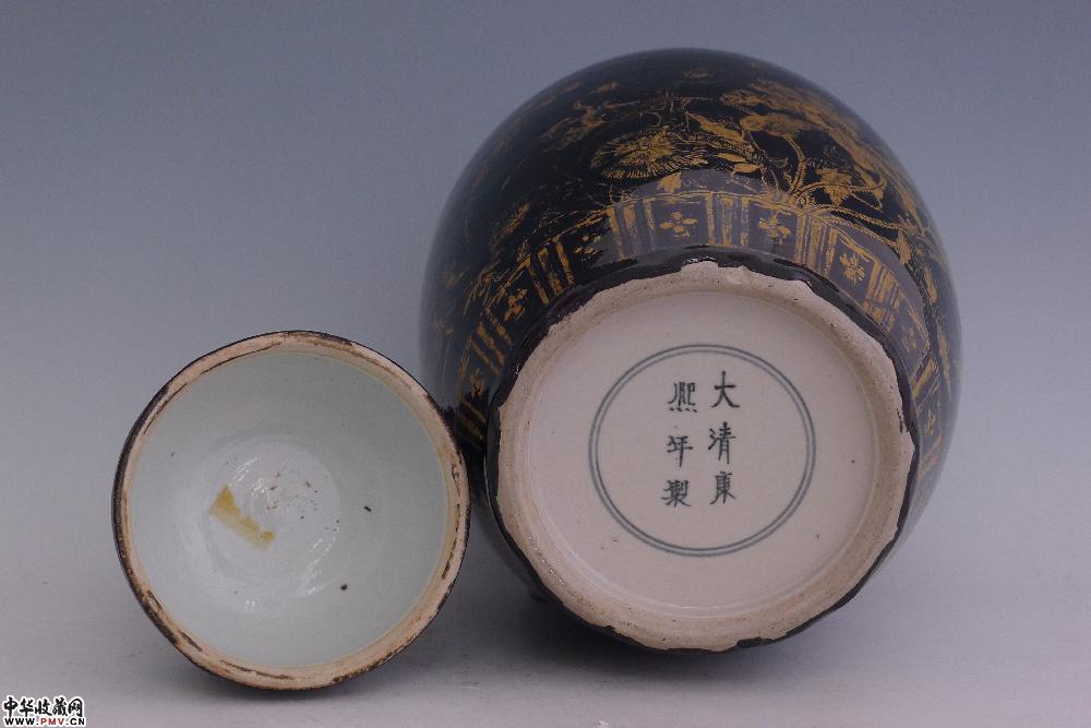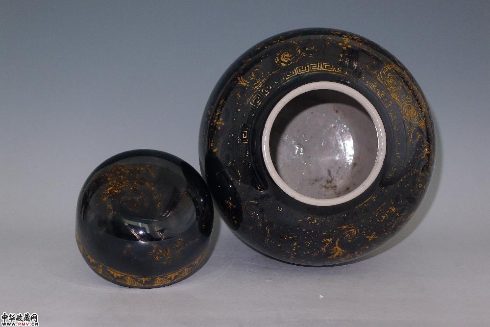 民国乌金釉描金花鸟纹盖罐