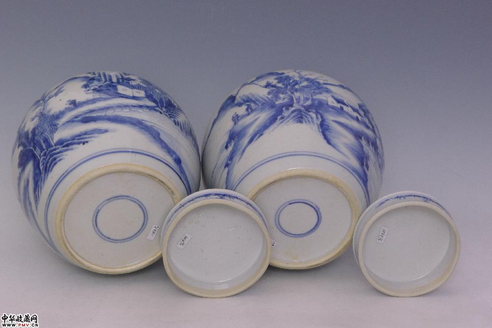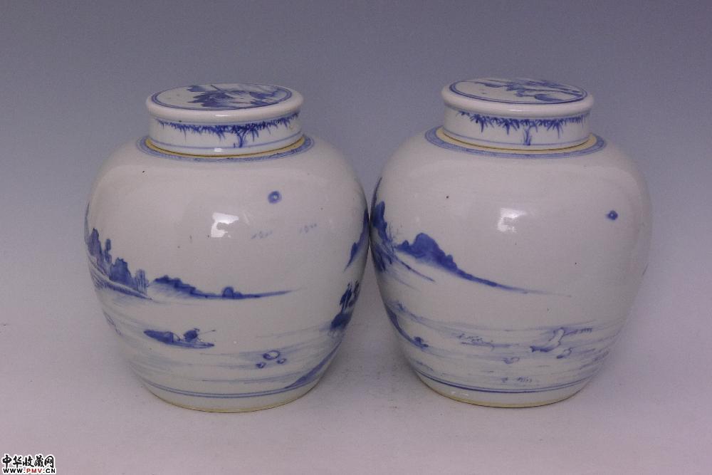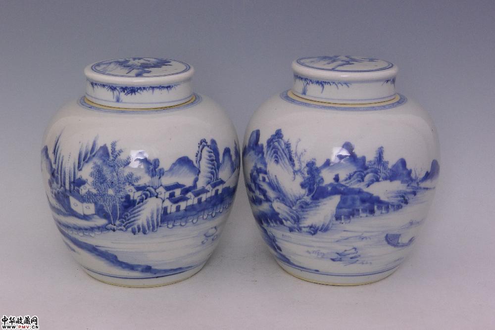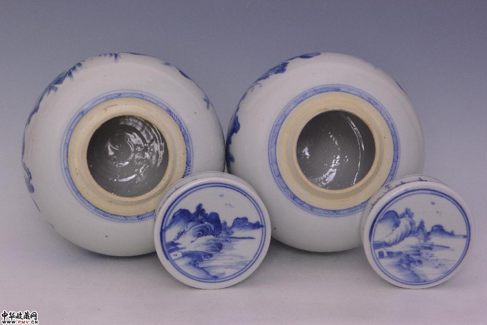 清乾隆景德镇窑青花山水人物纹盖罐(一对)