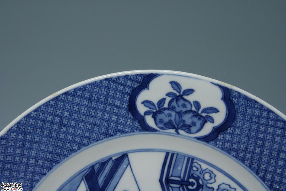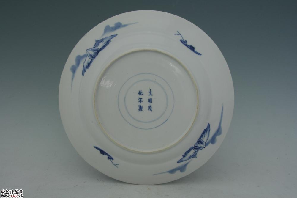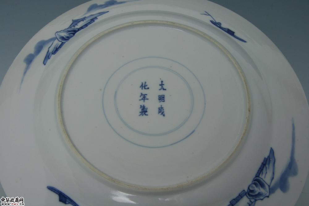 高3.2厘米,口径28.7厘米,底径16厘米,口沿小嗑修补,“大明成化年制”青花双圈款。