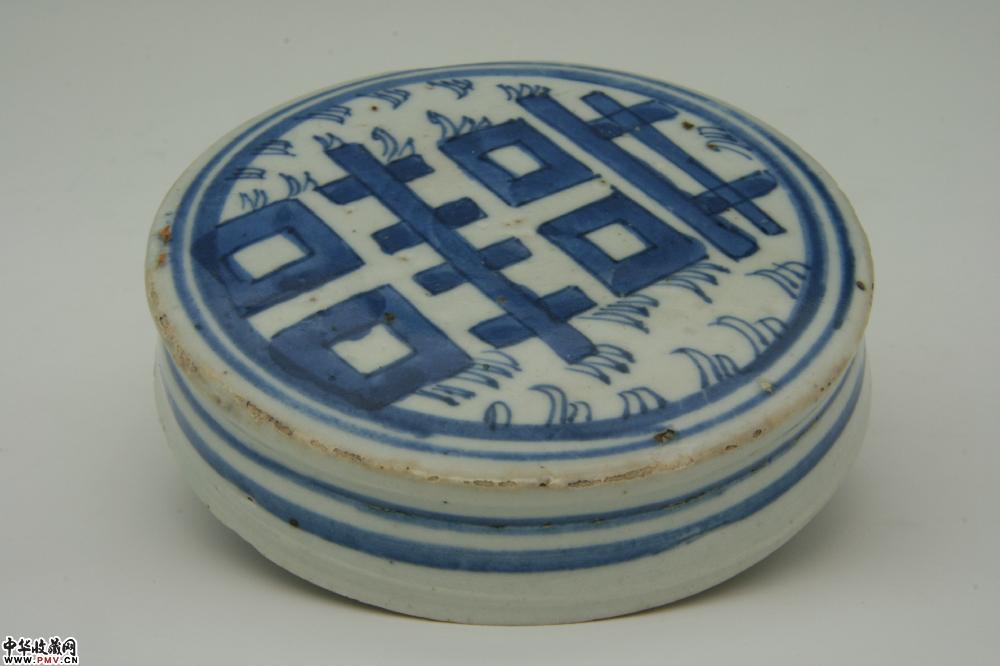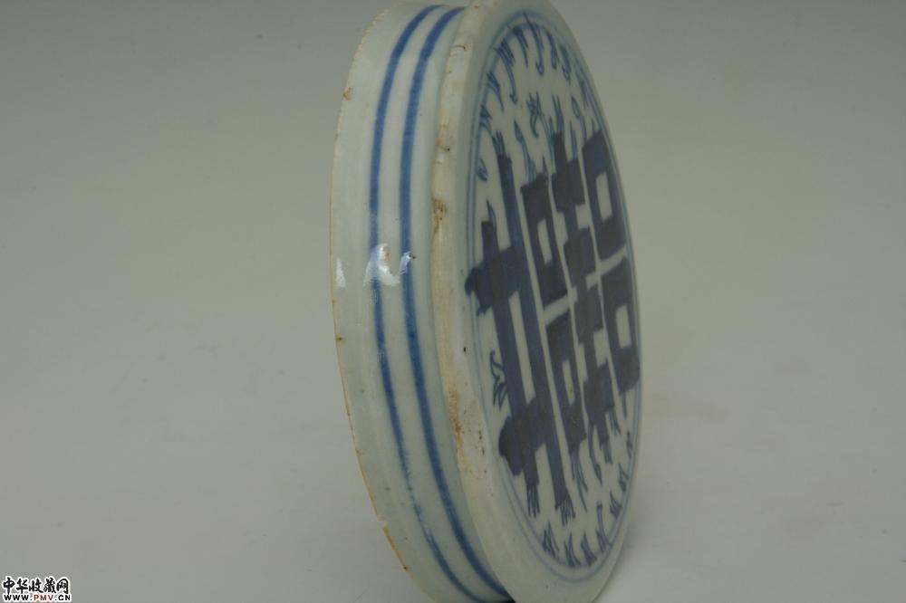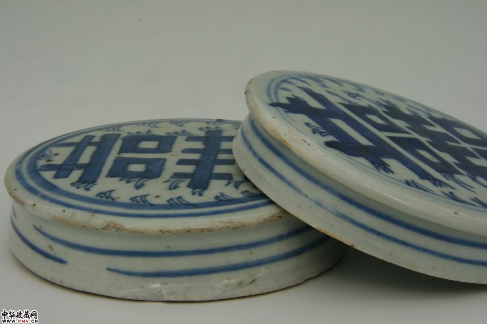通高21.7-22cm,口径9cm,底径17cm,一画三双喜,口沿小磕,盖沿小嗑及剥釉;另一画四双喜,盖沿小磕。