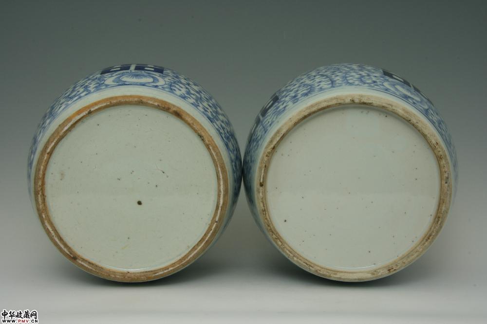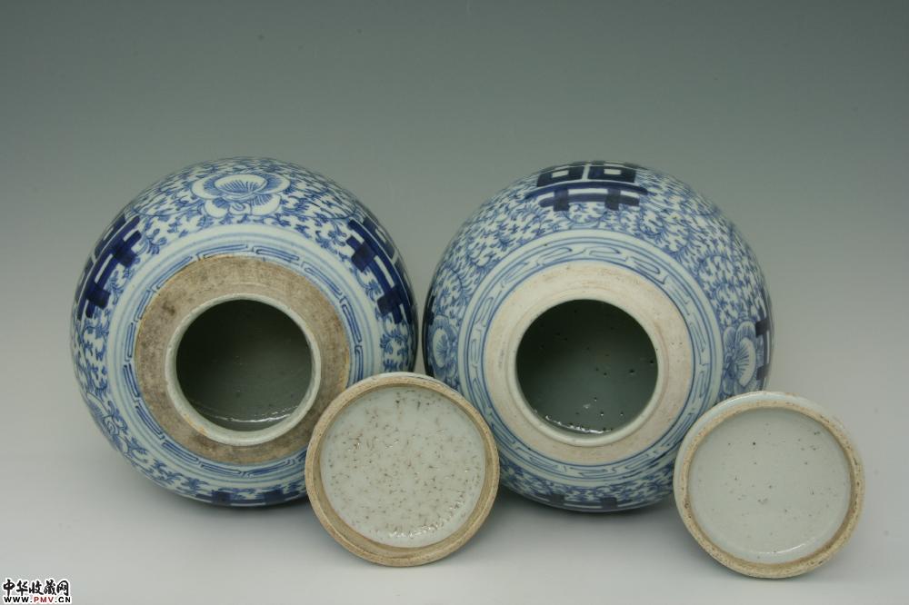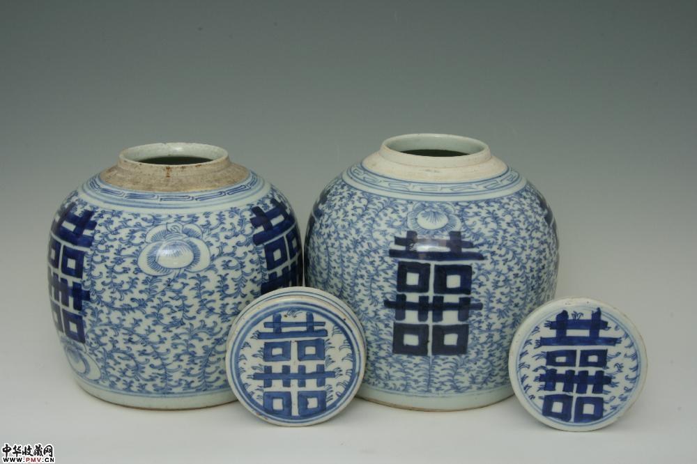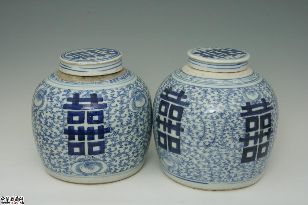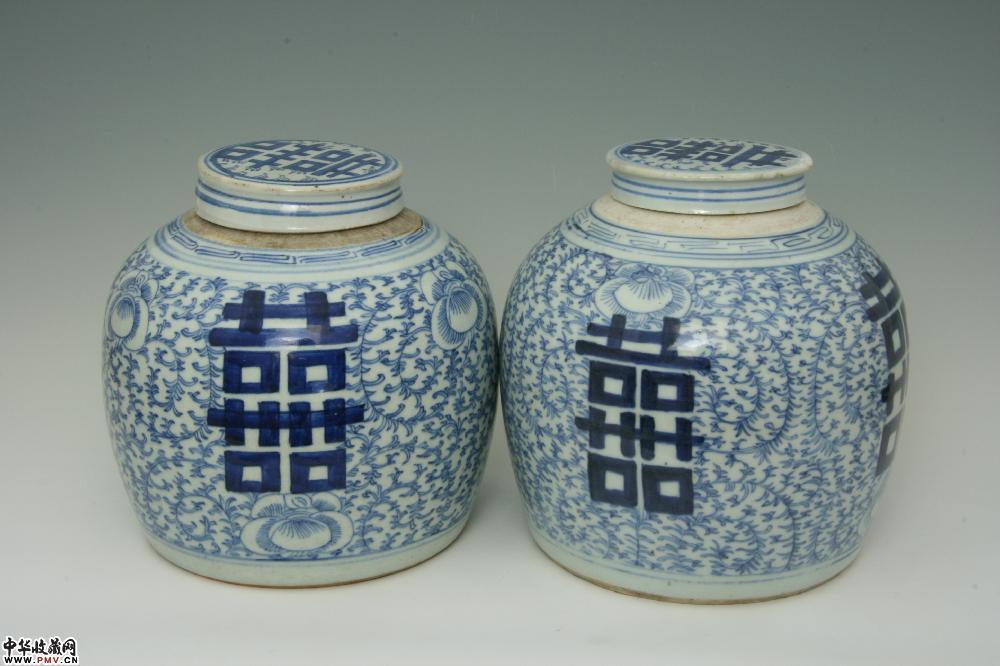 清道光景德镇窑青花淡描缠枝牡丹双喜盖罐(一对)