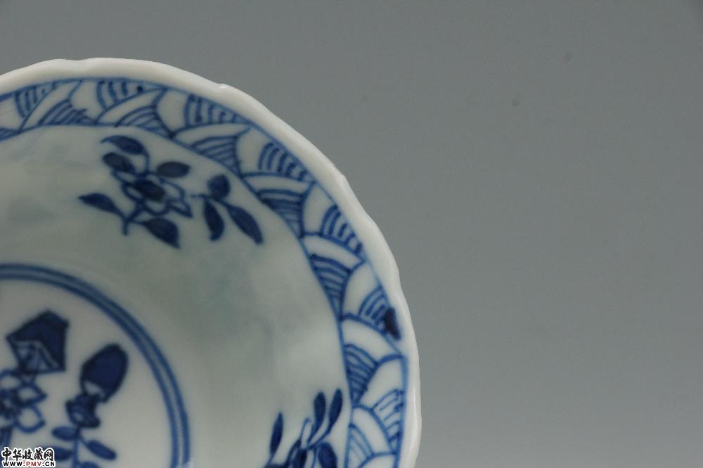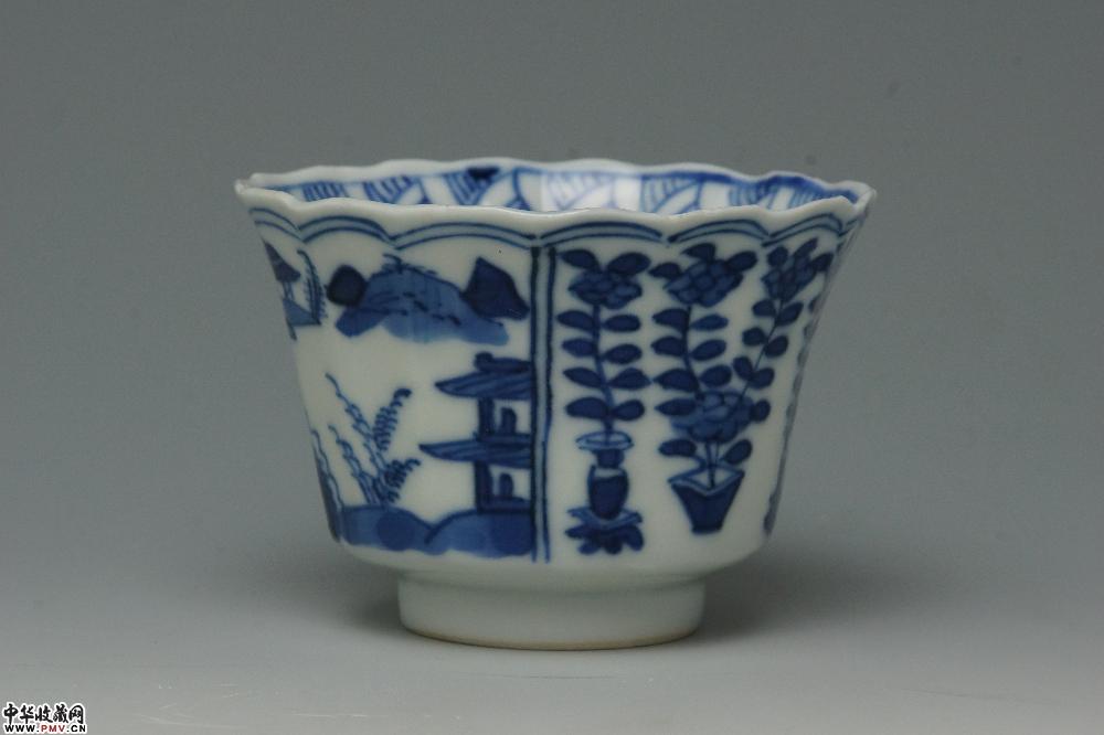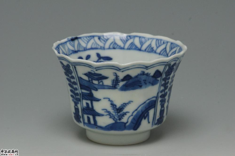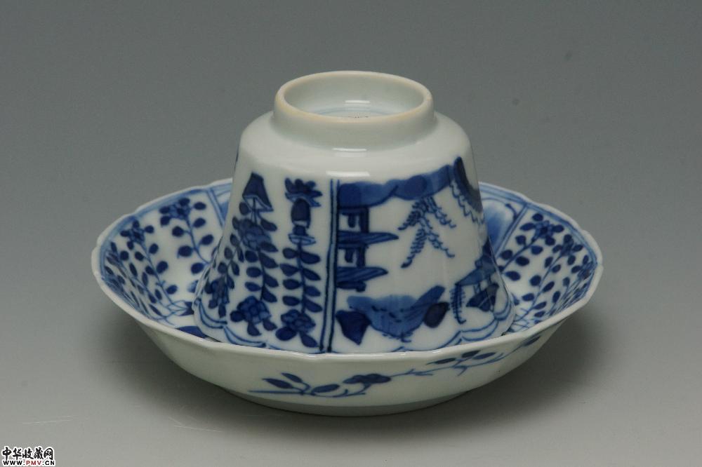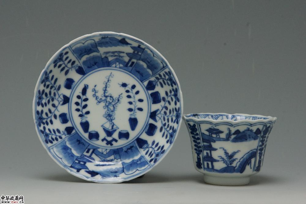 清光绪景德镇窑青花开光山水花卉纹菱口杯碟(一套)