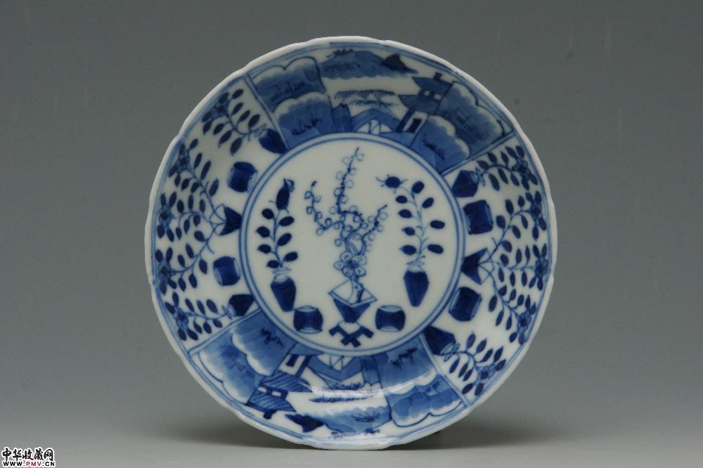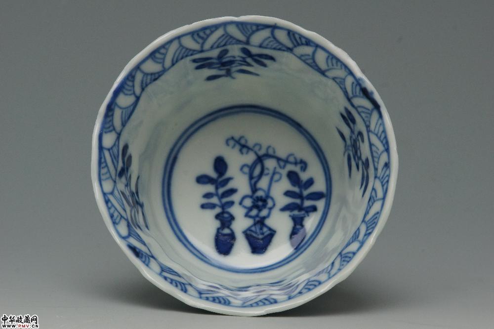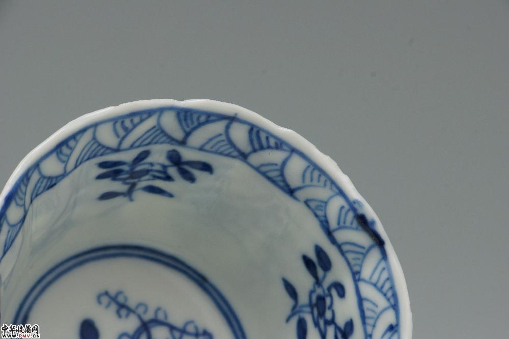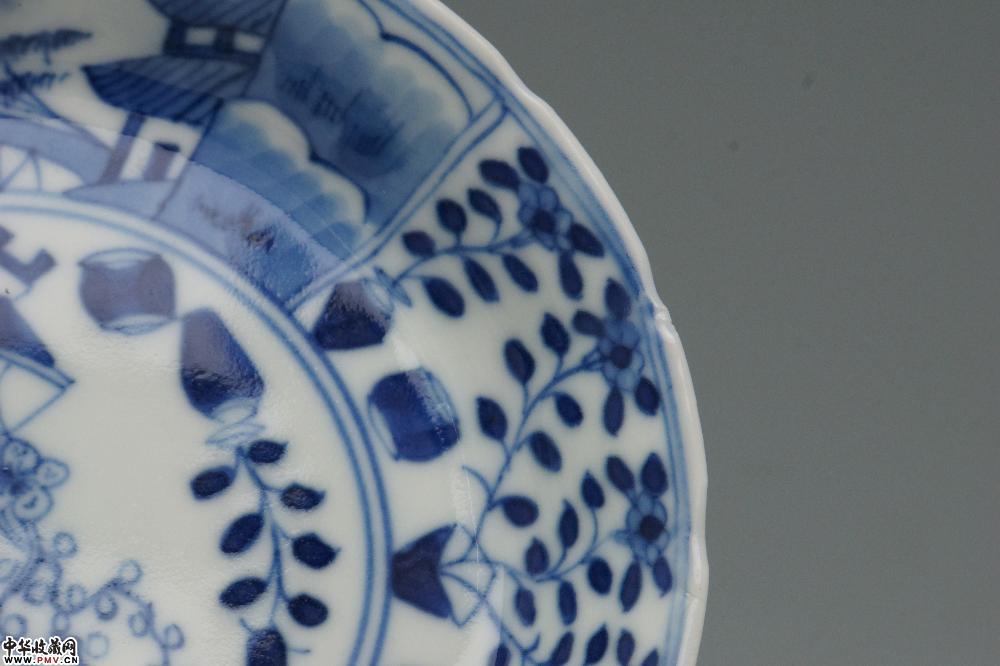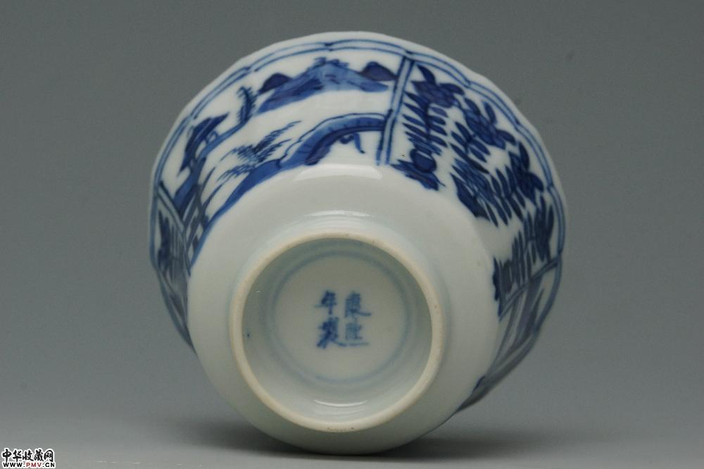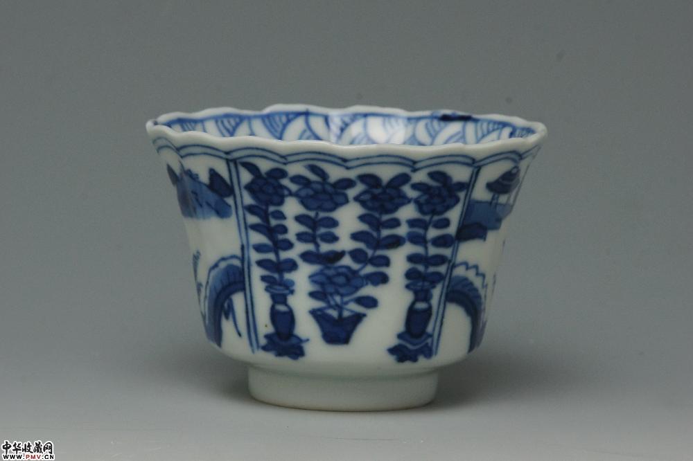 清光绪景德镇窑青花开光山水花卉纹菱口杯碟(一套)