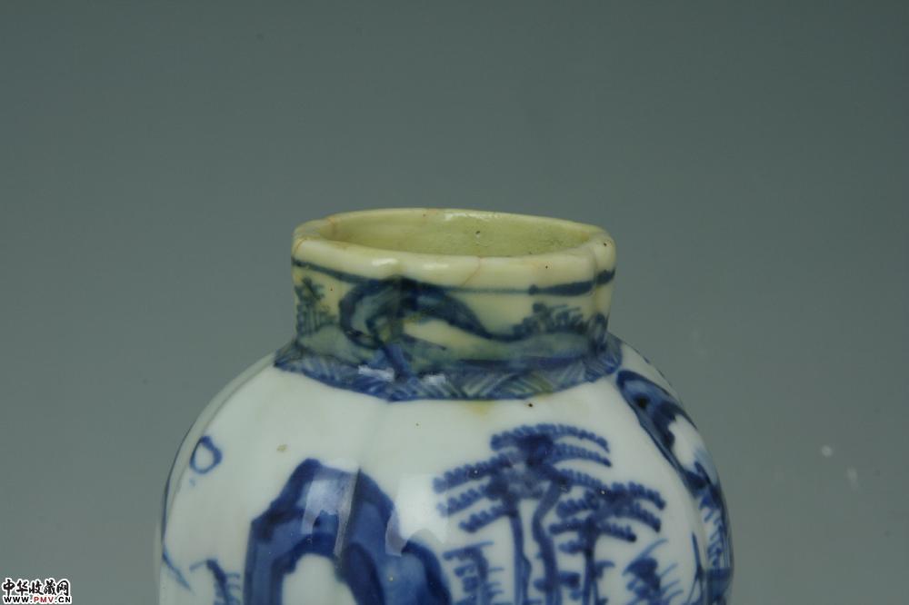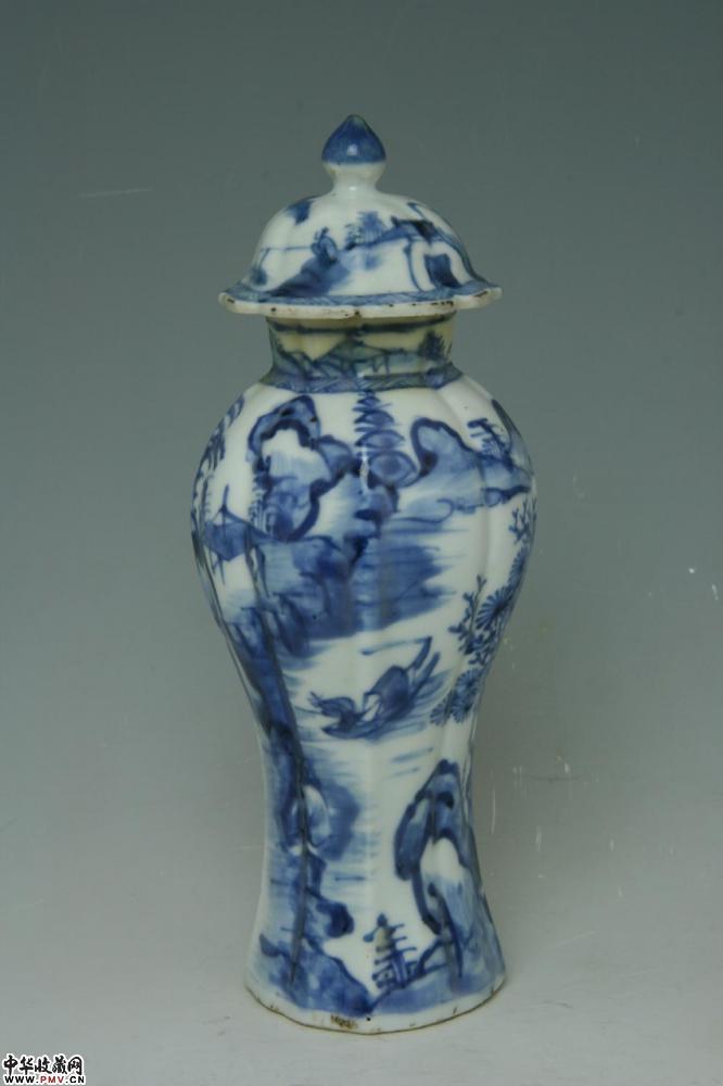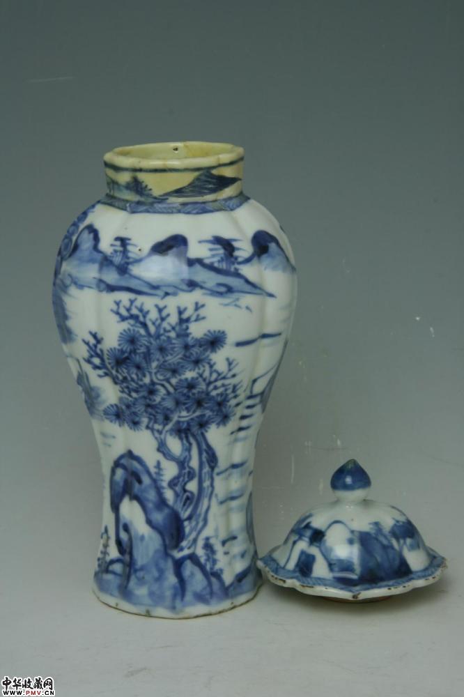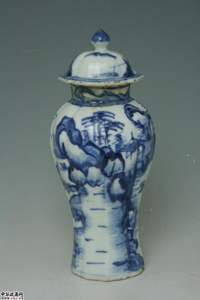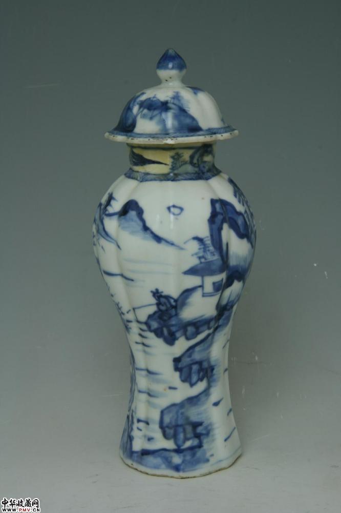 清乾隆景德镇窑青花山水纹瓜楞盖瓶