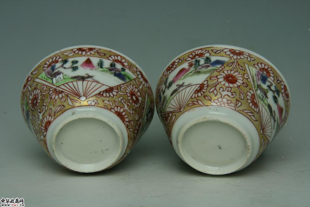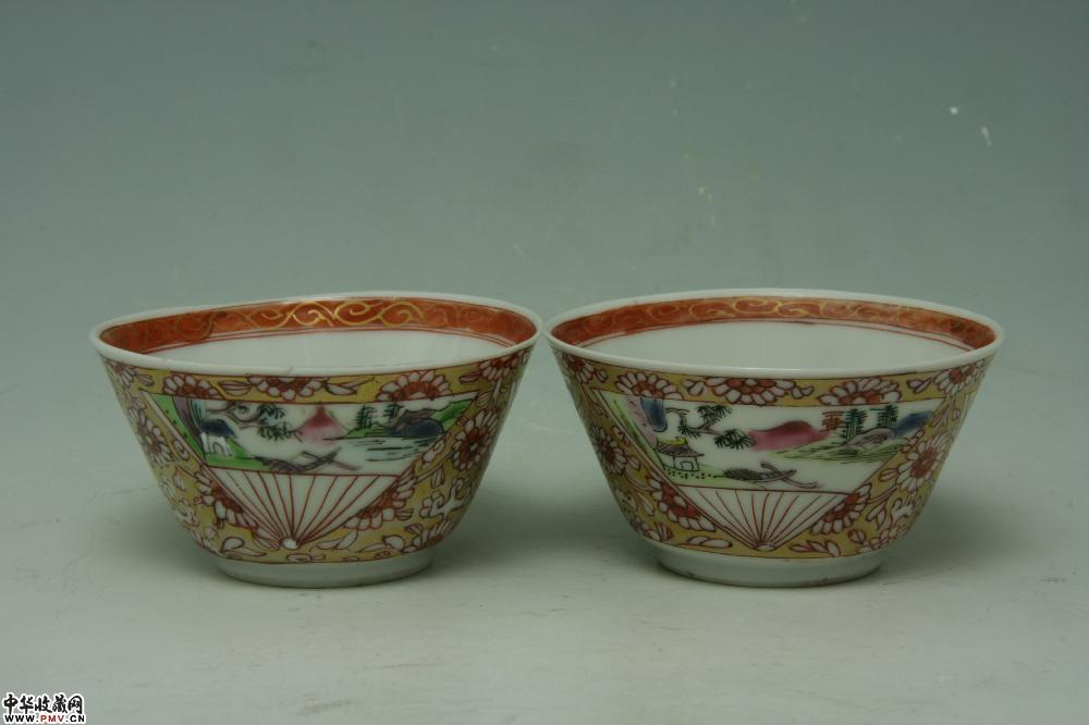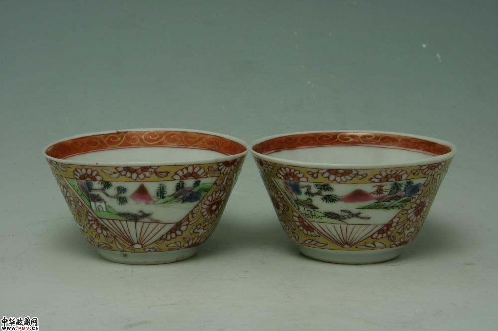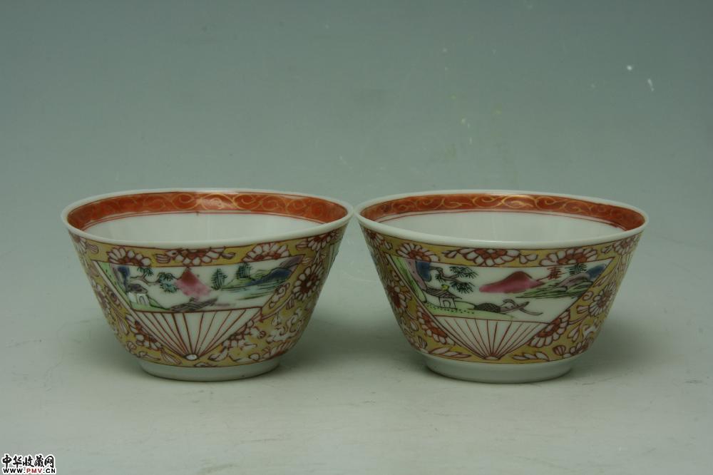 清雍正景德镇窑粉彩开光山水雄鸡纹杯(2只)
