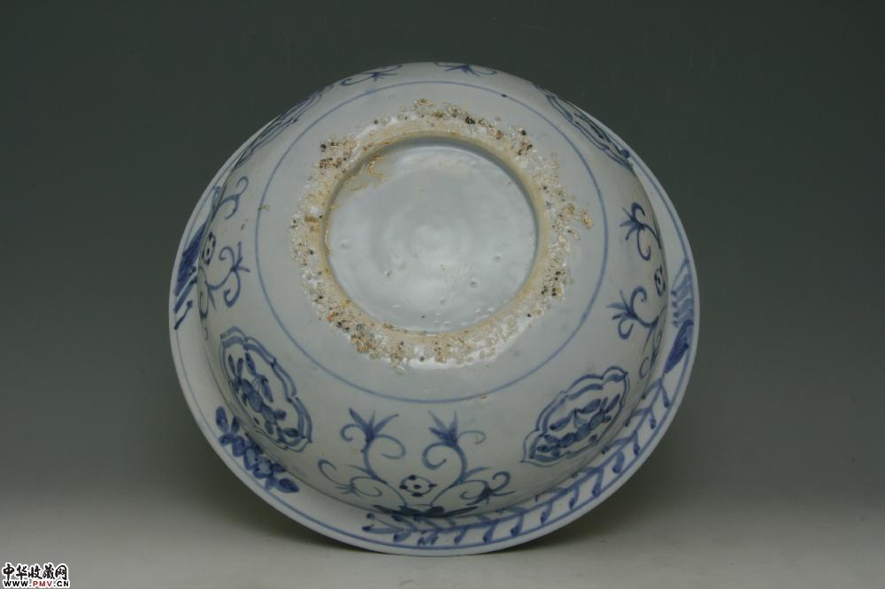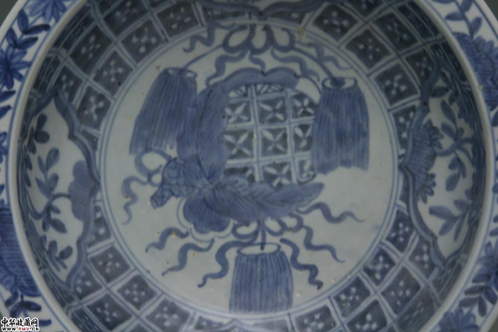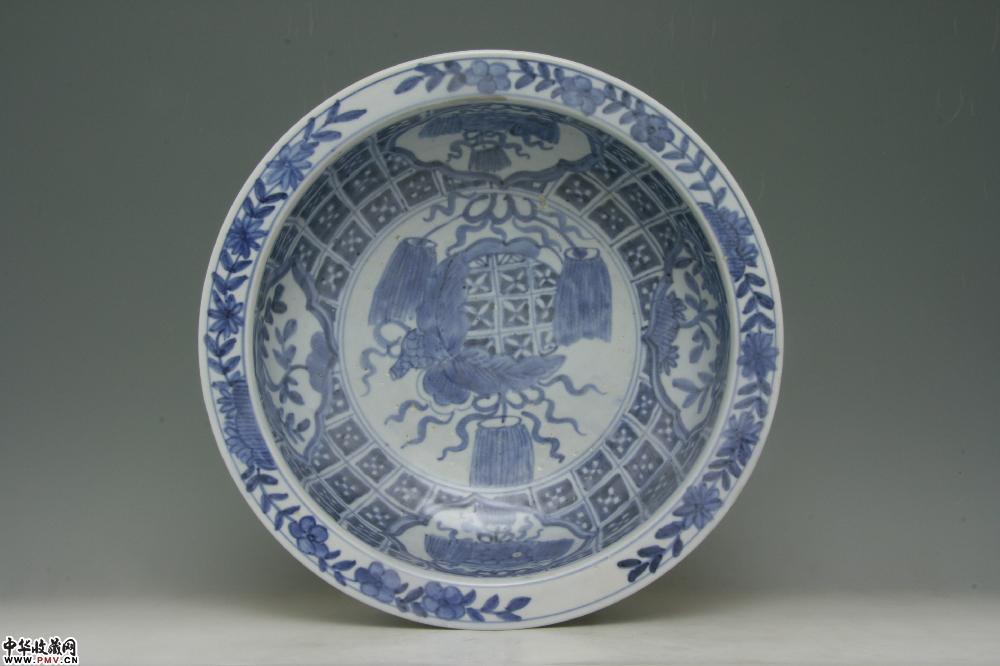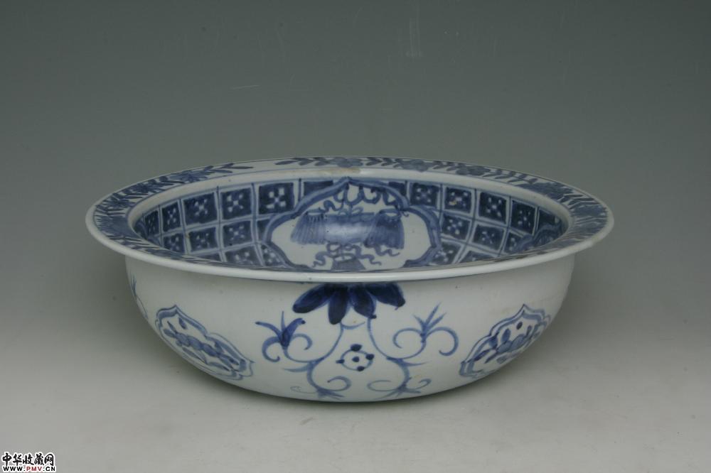 明万历平和窑青花开光花卉纹折沿盆