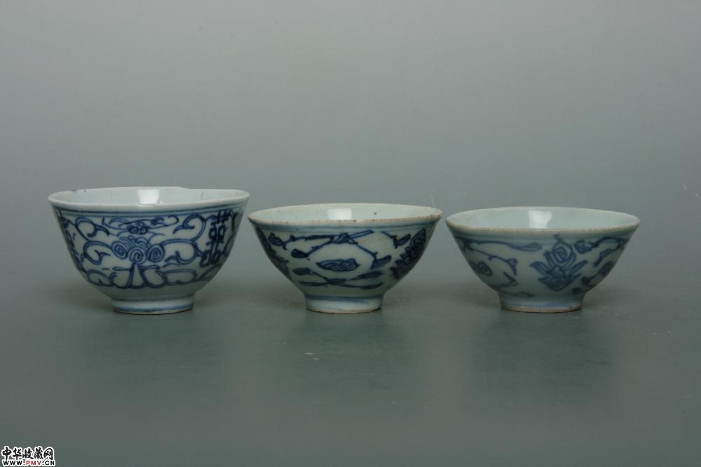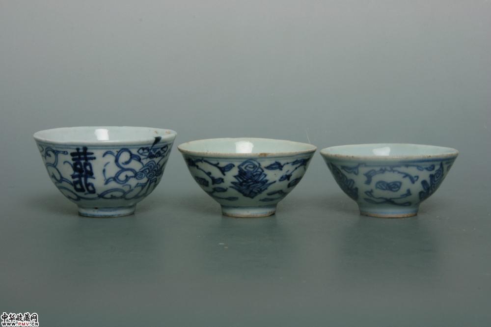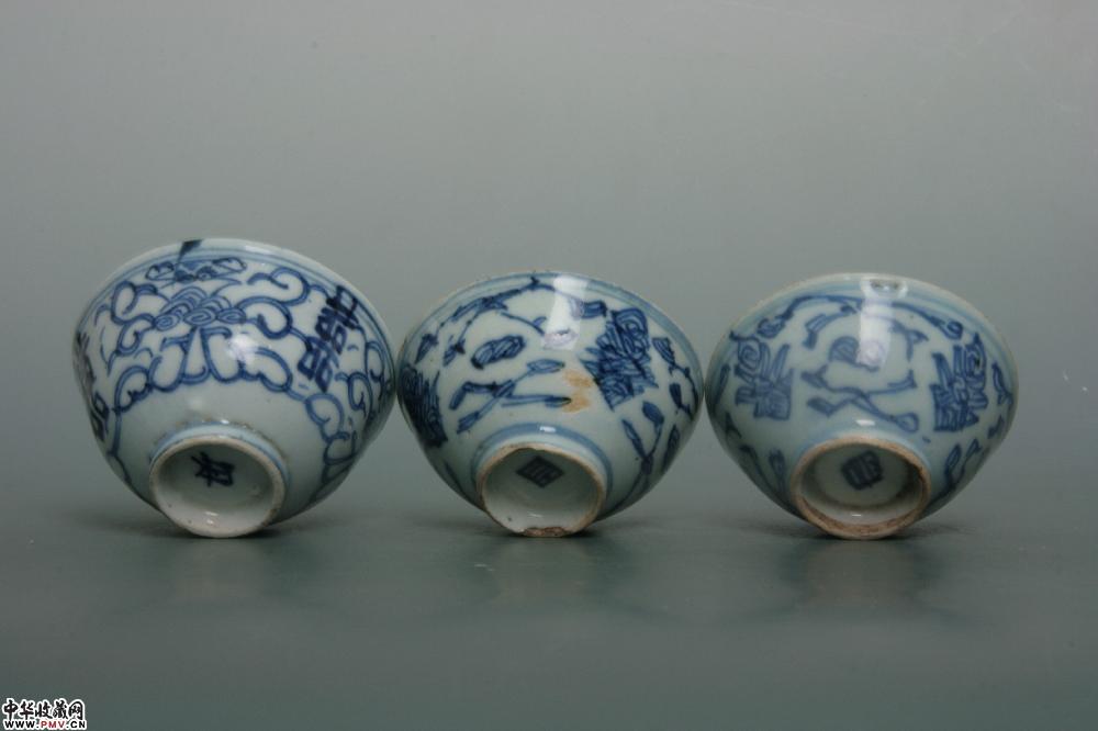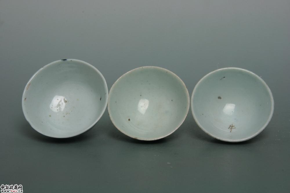 1口径8.7cm,小缩釉;2口径8.3cm,口沿及足沿小磕;3口径8.2cm,里内刻“牛”字,小缩釉,足沿小磕。
