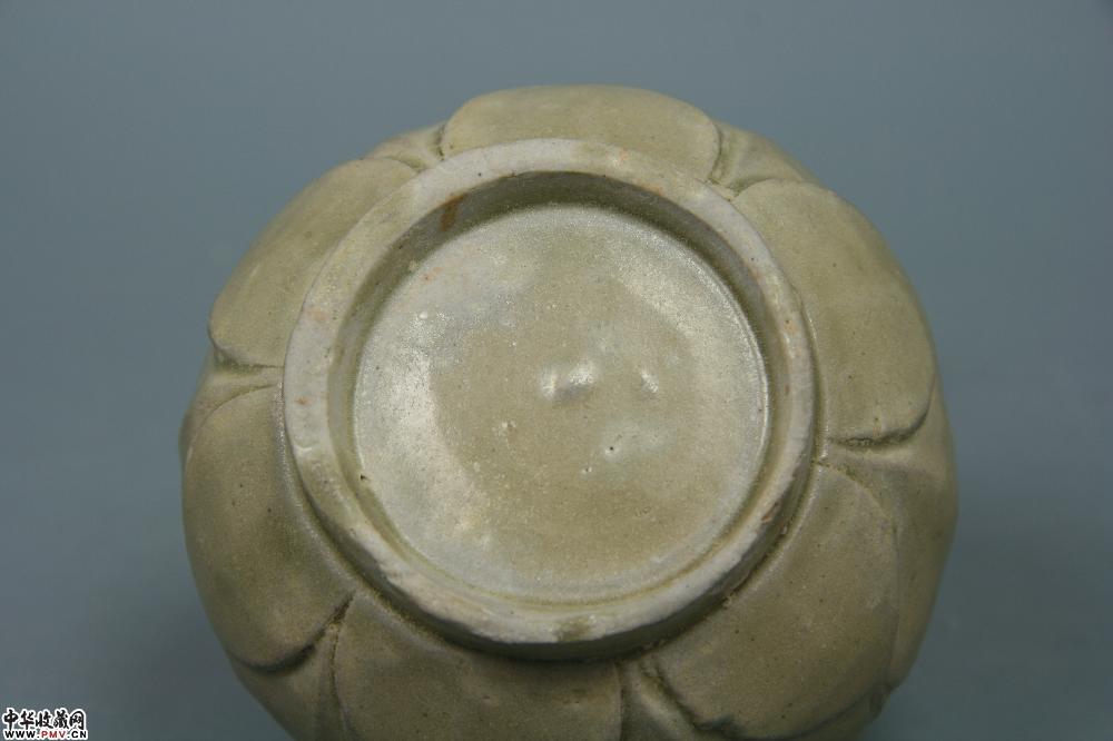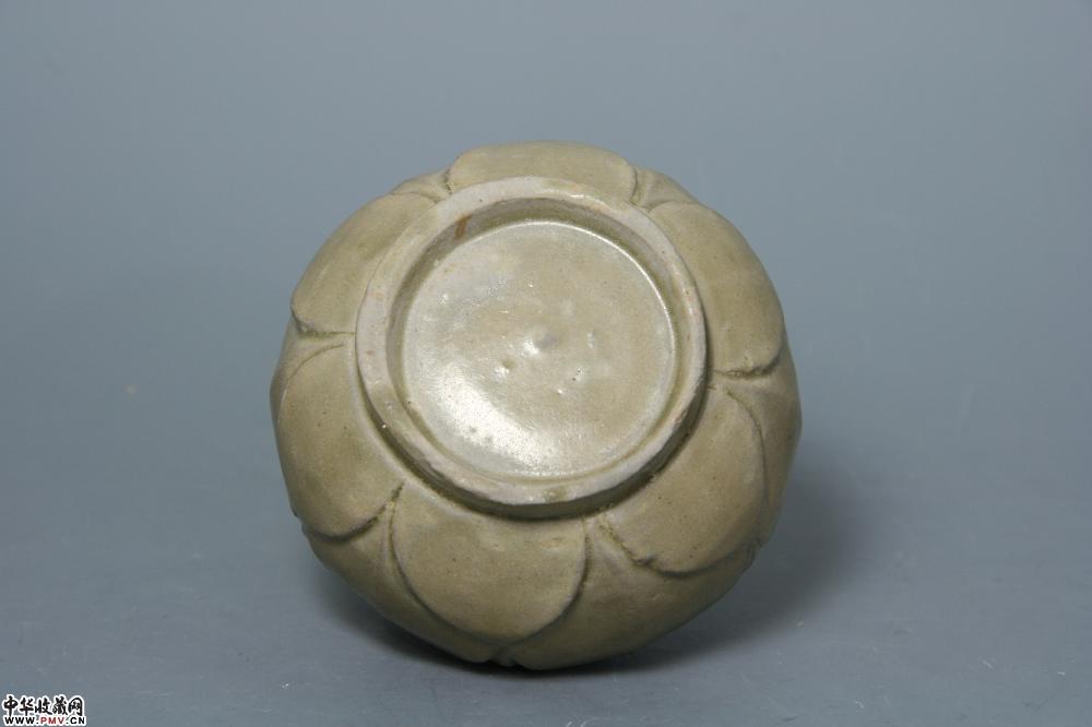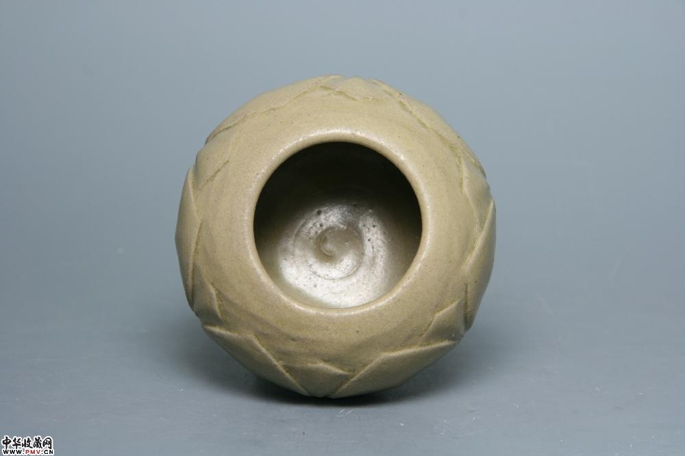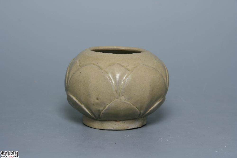 高6.8厘米,口径5厘米,底径5.8厘米。束口、圆鼓腹、圈足,施青釉,外腹刻大莲瓣纹,为文房用具,收录于广东人民出版社出版的《玩物致知-中华博物网会员藏品集》一书中,见P46-47。此外在浙江省博物馆有类似藏品。